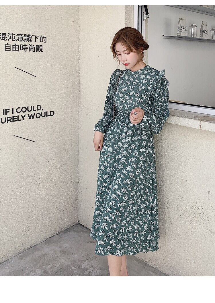 送料無料୨♥୧ 2021スプリングオータムレディースロングドレス スタンドカラーカラーフリルフローラルプリントグリーンプリーツスリーブシックドレス ワンピース AOS88702783930