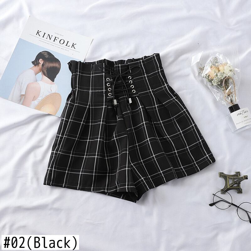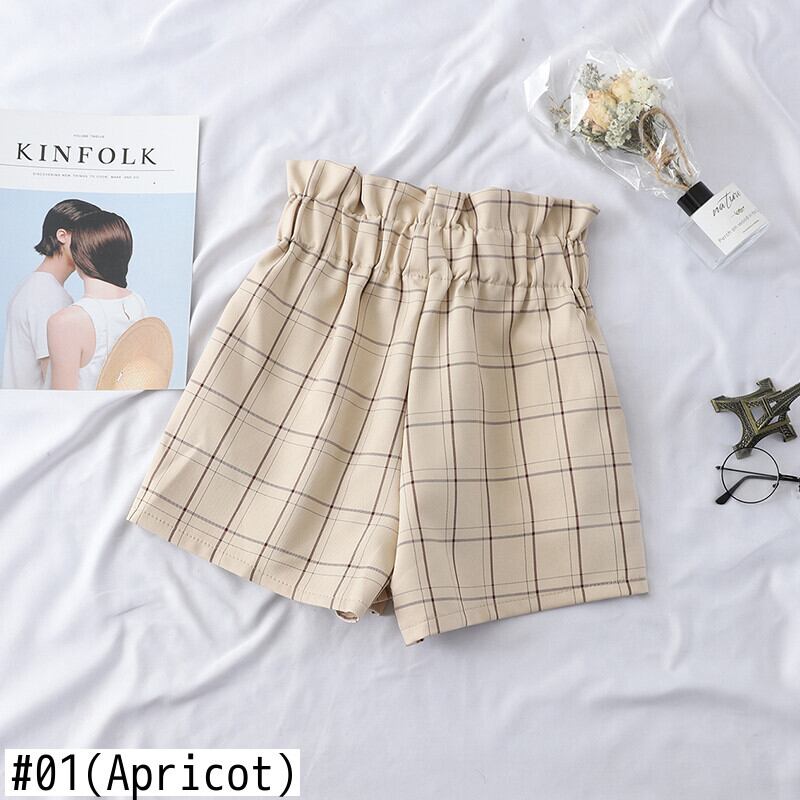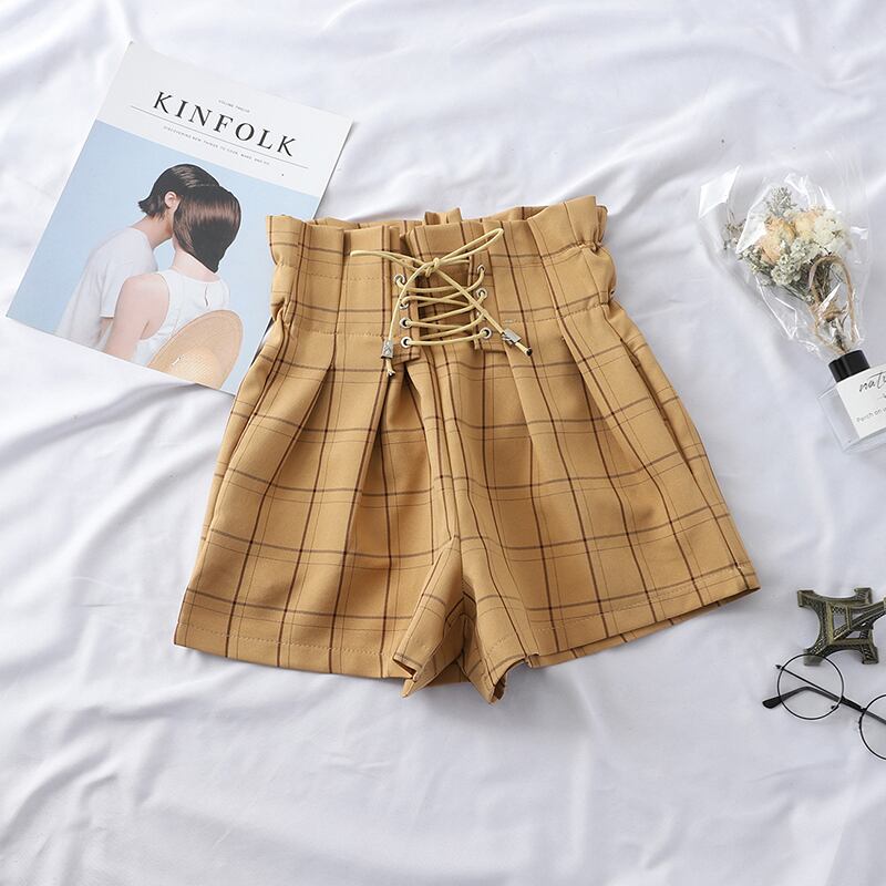 送料無料୨♥୧ ese原宿サマーレディースストリートウェアショーツ ウェストカーキアプリコットブラックバンドルーズ格子柄 AOS33707914142