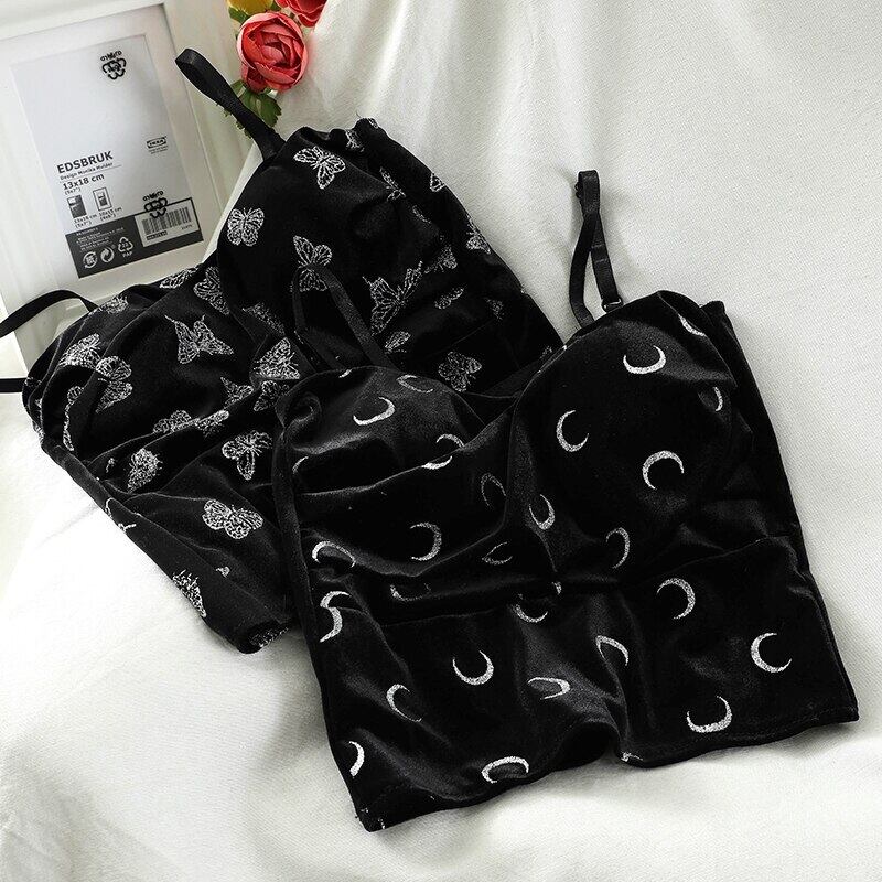送料無料୨♥୧ 2021サマーレディースストリートウェア収穫トップス ゴシックパンクスタイル月Butterflyデザイン ドットプリントセクシータンク可愛いブラックベルベットキャミ AOS48975115817