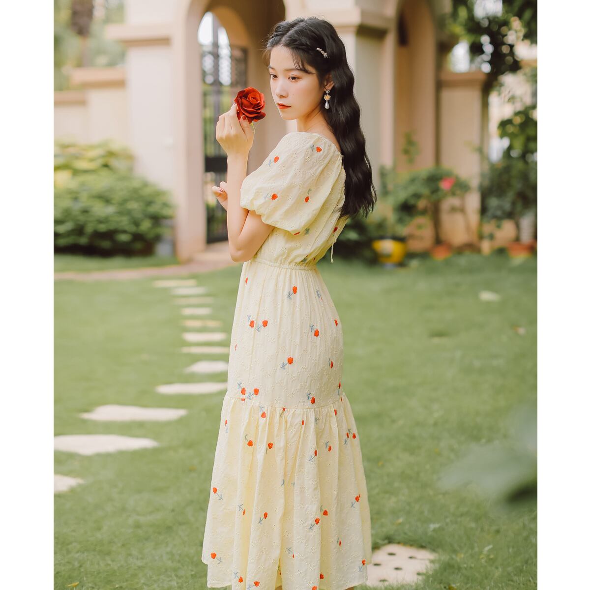 送料無料୨♥୧ 2021森サマーレディース甘いミディドレス Vネックフローラル刺繍ホローでるパフスリーブコットンフリルイエロー AOS70427677528