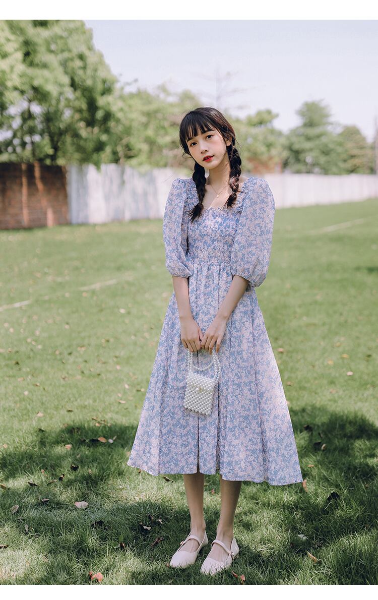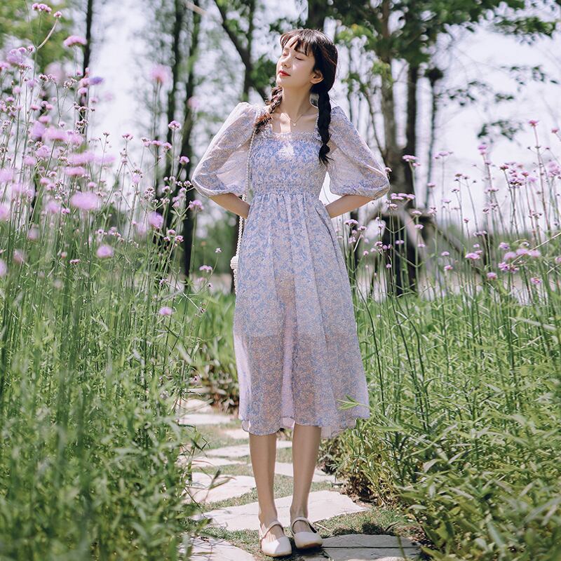 送料無料୨♥୧ 2021草原シックサマーレディースミディドレス 平方カラー光紫のフローラルプリントロマンチックベスティドス森 AOS75885564472