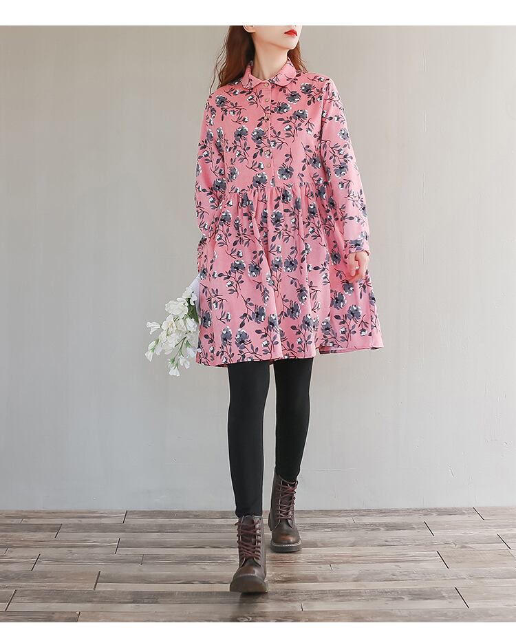 送料無料୨♥୧ 森スプリングオータムレディースミニドレス 断るカラーピンクフローラルルーズ可愛いコーデュロイ甘い AOS36167024333