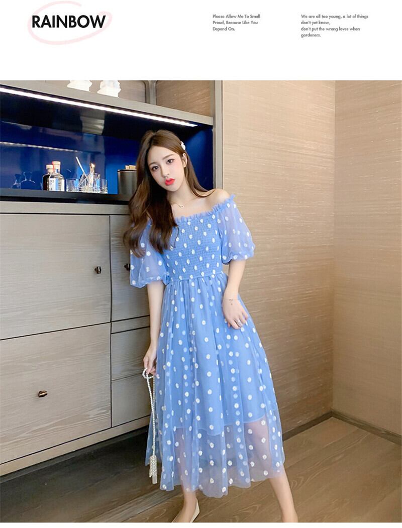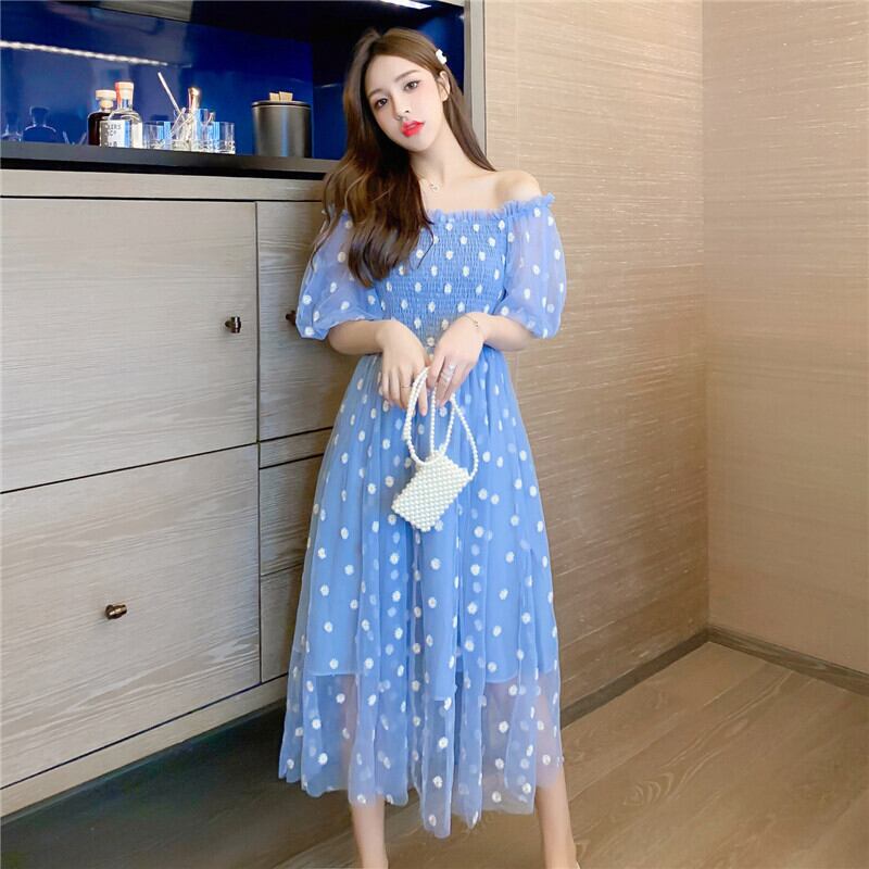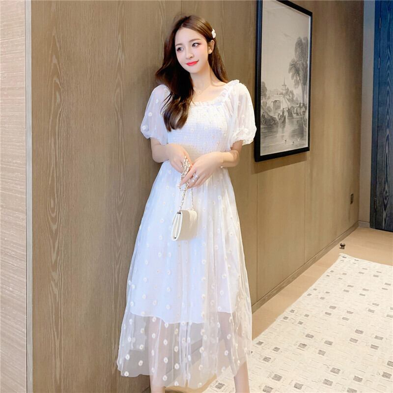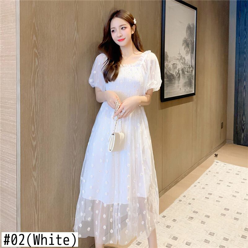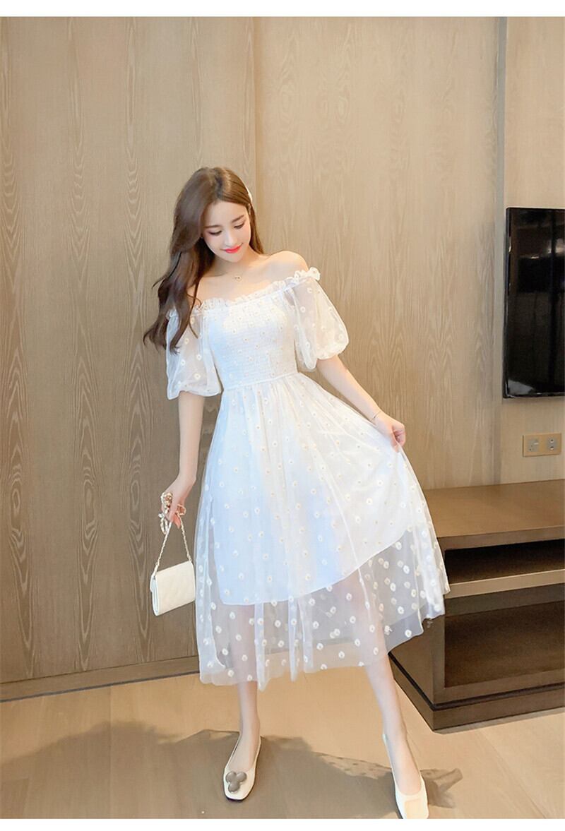 送料無料୨♥୧ 2021サマーレディースフローラルドレス スラッシュ首ホワイトブルー刺繍メッシュビーチパフスリーブミディ AOS29111748068