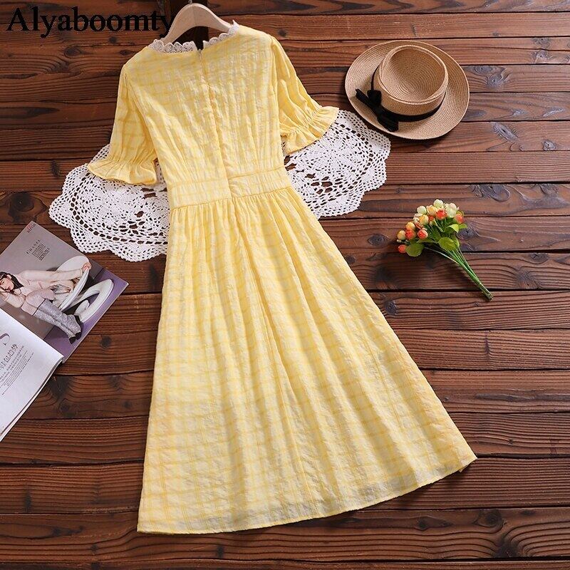 送料無料୨♥୧ ese森サマーレディース新鮮なドレス 平方カラーイエロー紫の甘い半袖スリーブシックミディ AOS4004836810