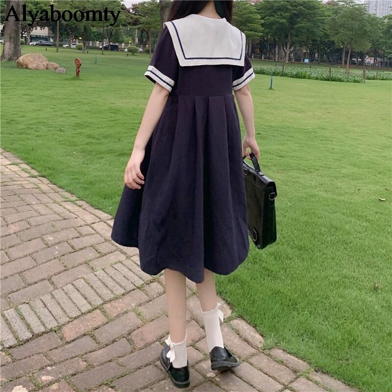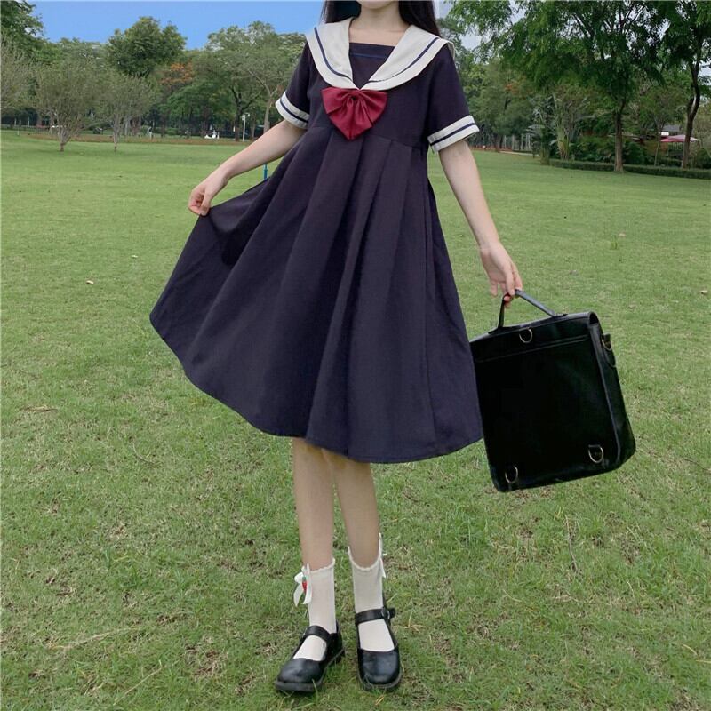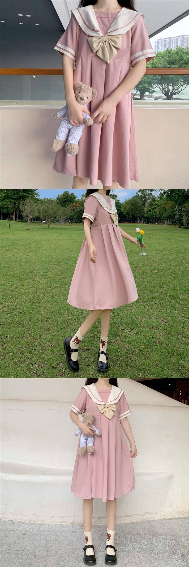 送料無料୨♥୧ eseプレッピースタイルサマーレディース可愛いドレス 船乗りカラーリボンネイビーブルーピンクウェストプリーツコスプレドレス ワンピース AOS23832503760