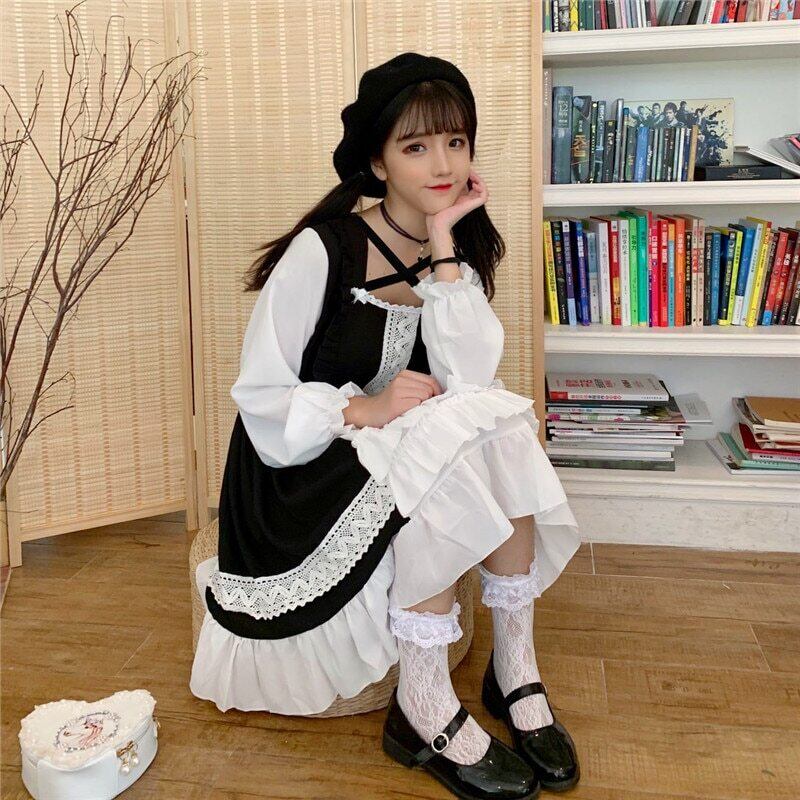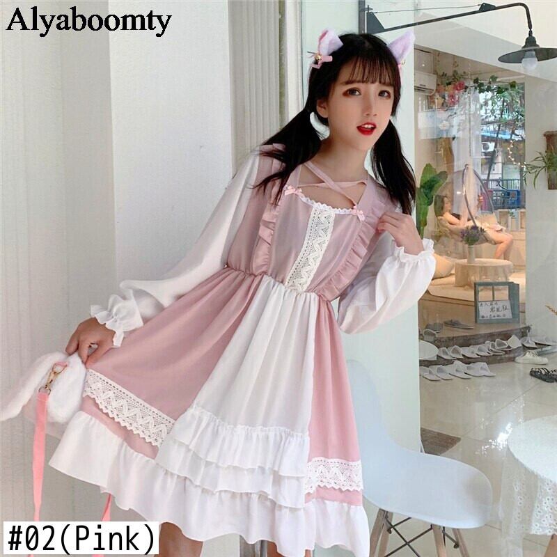 送料無料୨♥୧ eseスプリング秋レディースロリータドレス クロスカラーコントラスト可愛い甘いホローでるフリルピンクブラック AOS94796377235