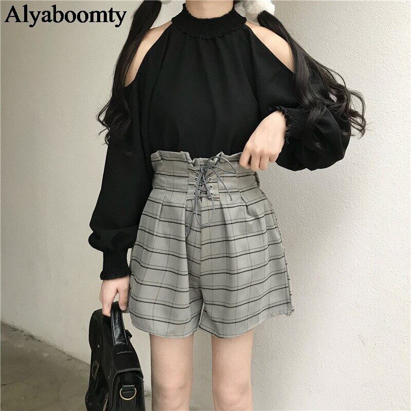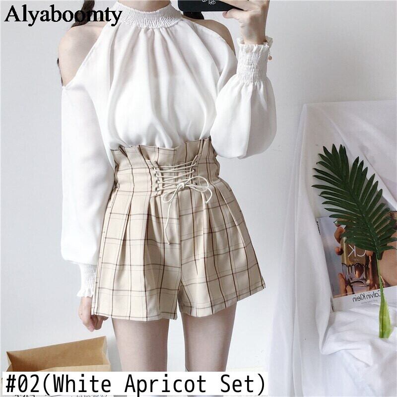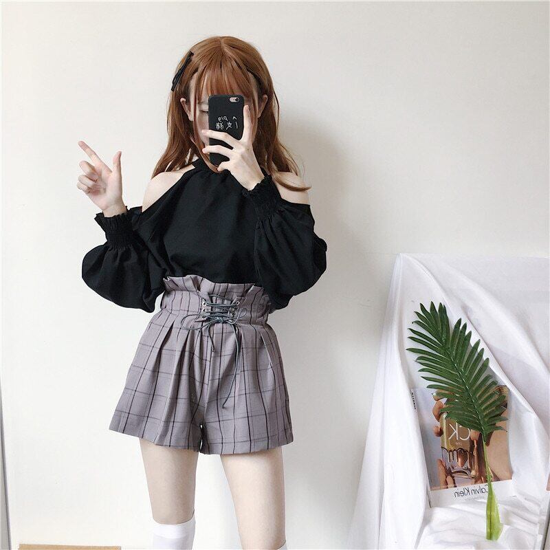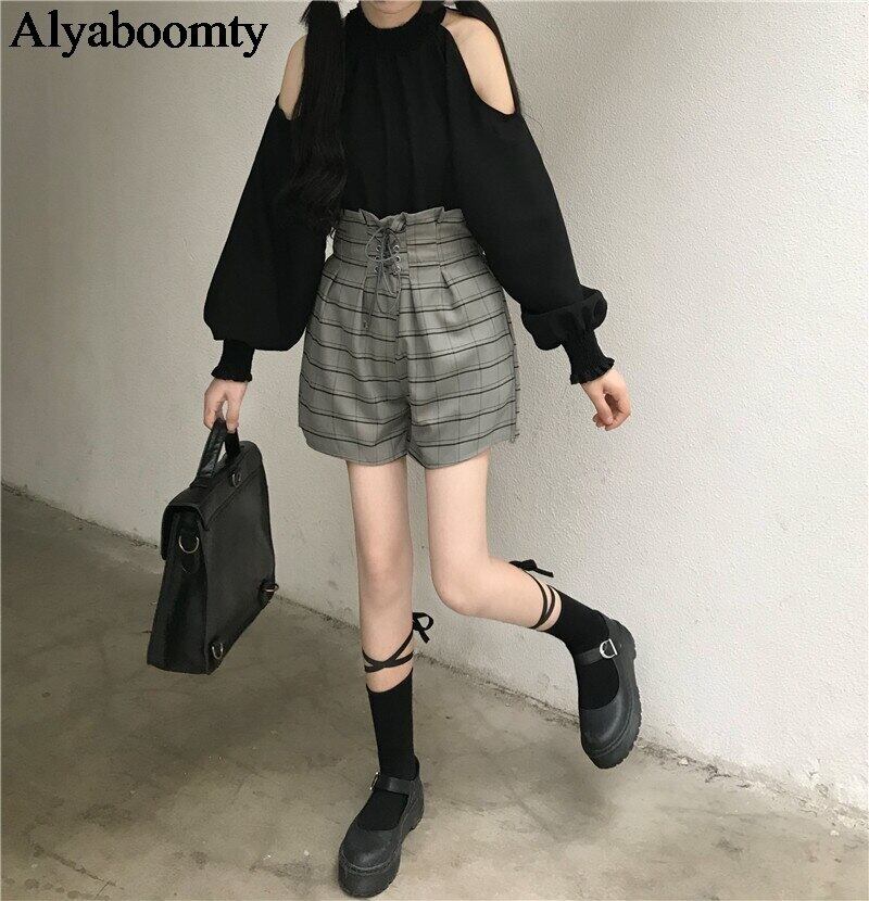 送料無料୨♥୧ ese原宿ストリートウェアレディース2個セット ゴシックオフショルダーウェスト格子柄バンドショーツ 可愛いの AOS94483077908
