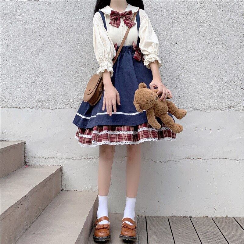送料無料୨♥୧ 2eseレディースロリータピーターパンカラーコットン七部袖スリーブ格子柄レースフリルスカート 可愛い個セット AOS56886493393