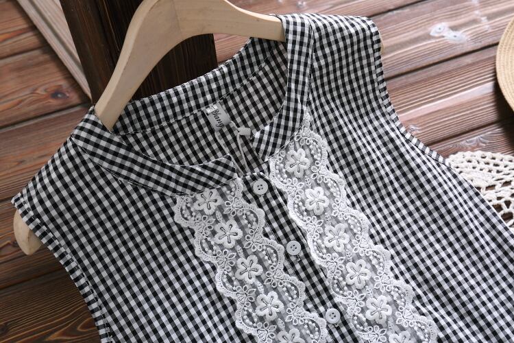 送料無料୨♥୧ サマーレディースプレッピースタイルドレス ブラック格子柄Flowerデザイン レースノースリーブ可愛い森フリル AOS12034997504