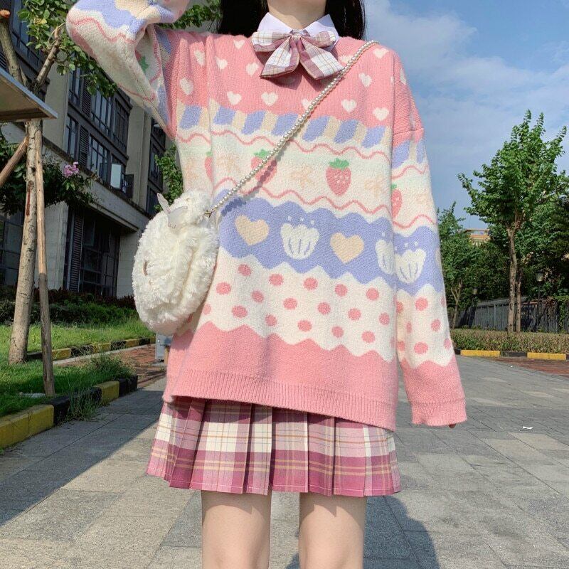 送料無料୨♥୧ eseプレッピースタイルオータムウィンターレディースセーター ピンクイチゴハートニットプルオーバー 可愛い甘い柔らかい AOS43057285099