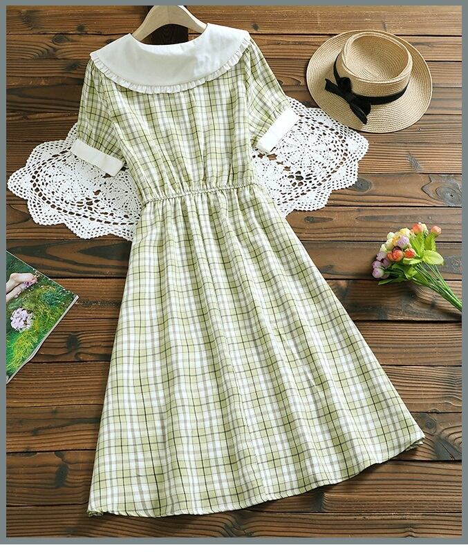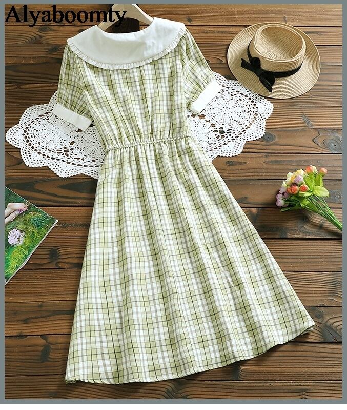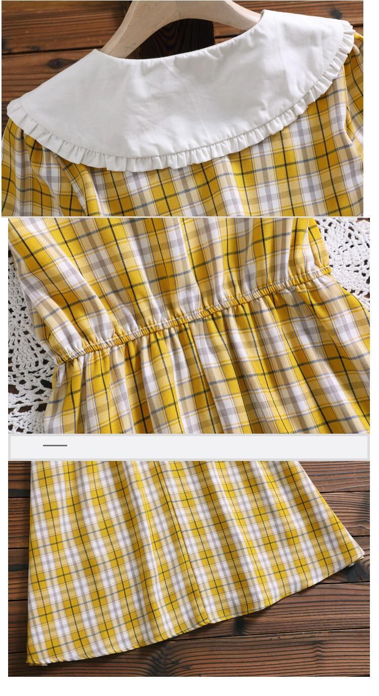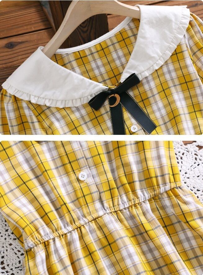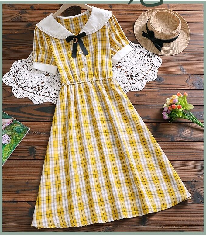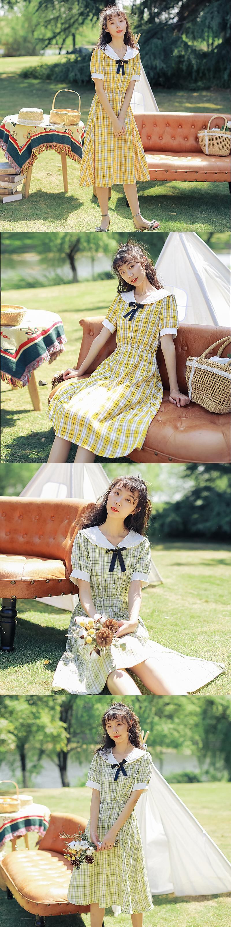 送料無料୨♥୧ プレッピースタイルサマーレディース甘いドレス リボンカラーイエローグリーン格子柄ヴィンテージ半袖スリーブAラインミディs-xl AOS46475732612