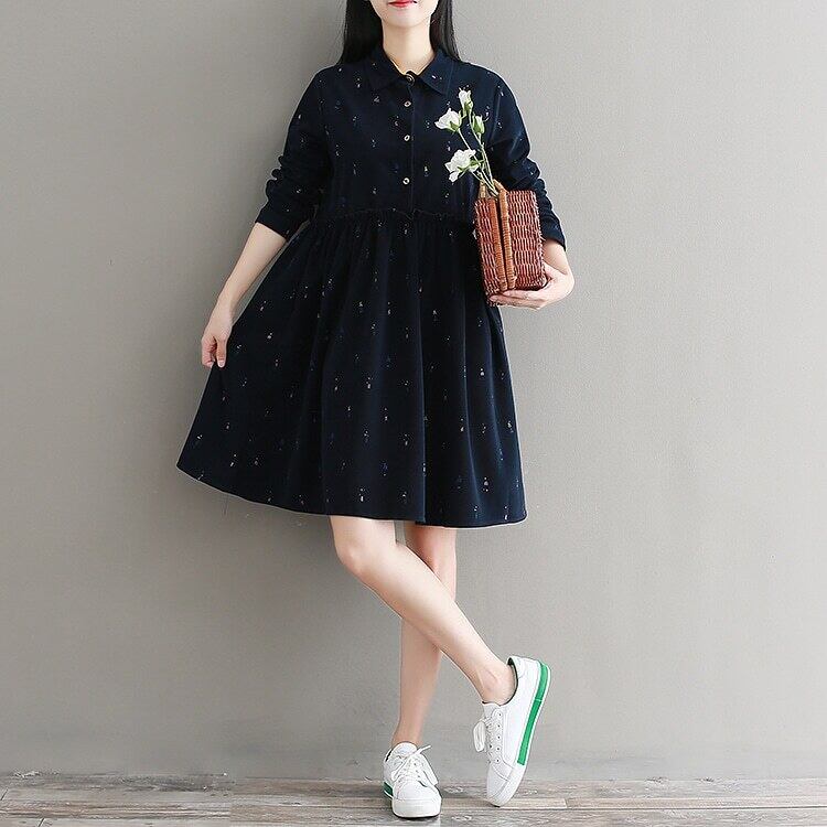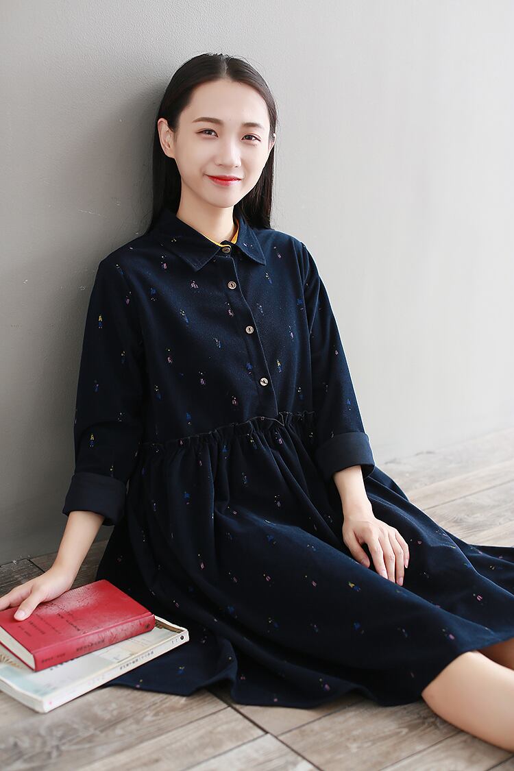 送料無料୨♥୧ 森スプリングオータムレディース可愛いドレス 順番ダウンカラーキャラクタープリント柄エルビス一杯スリーブヴィンテージコーデュロイm-2xl AOS33237856454
