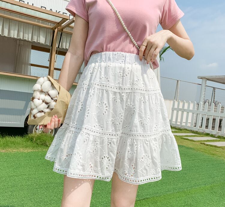 送料無料୨♥୧ シックサマーレディースミニスカート ウェストブラックホワイトフローラル刺繍ロパ可愛いホローでるフリル AOS84024491932