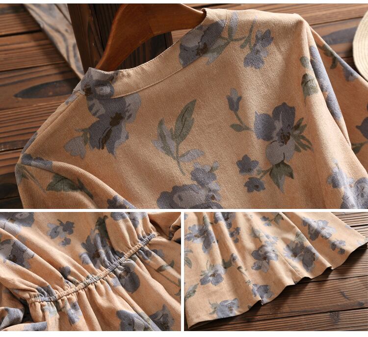 送料無料୨♥୧ 2021スプリングオータムレディースドレス ルーズウェストラウンドネックプリントコーデュロイベスティドス長袖スリーブヴィンテージドレス ワンピース AOS14626431041