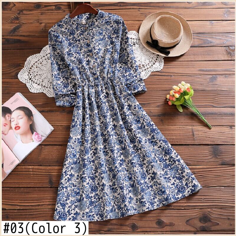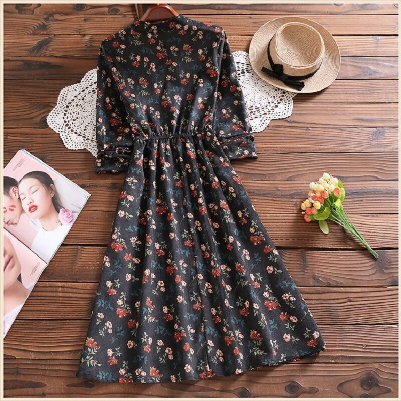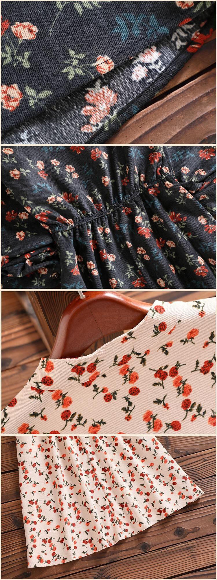 送料無料୨♥୧ 3オータムスプリング森レディースドレス スタンドカラーカラーフローラルプリントAラインコーデュロイ全試合 AOS49900115165