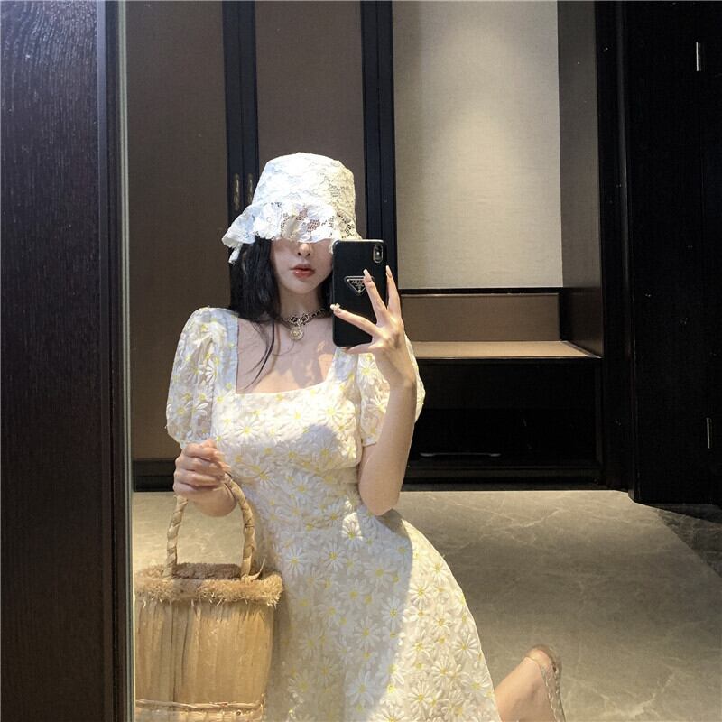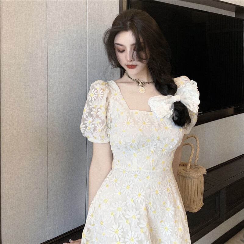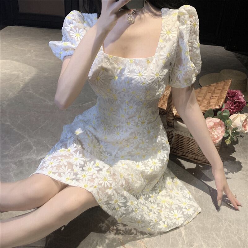 送料無料୨♥୧ 2021サマーレディースフランス語ロマンチックミニドレス 平方カラーフローラル刺繍甘いパフスリーブ AOS20553588268