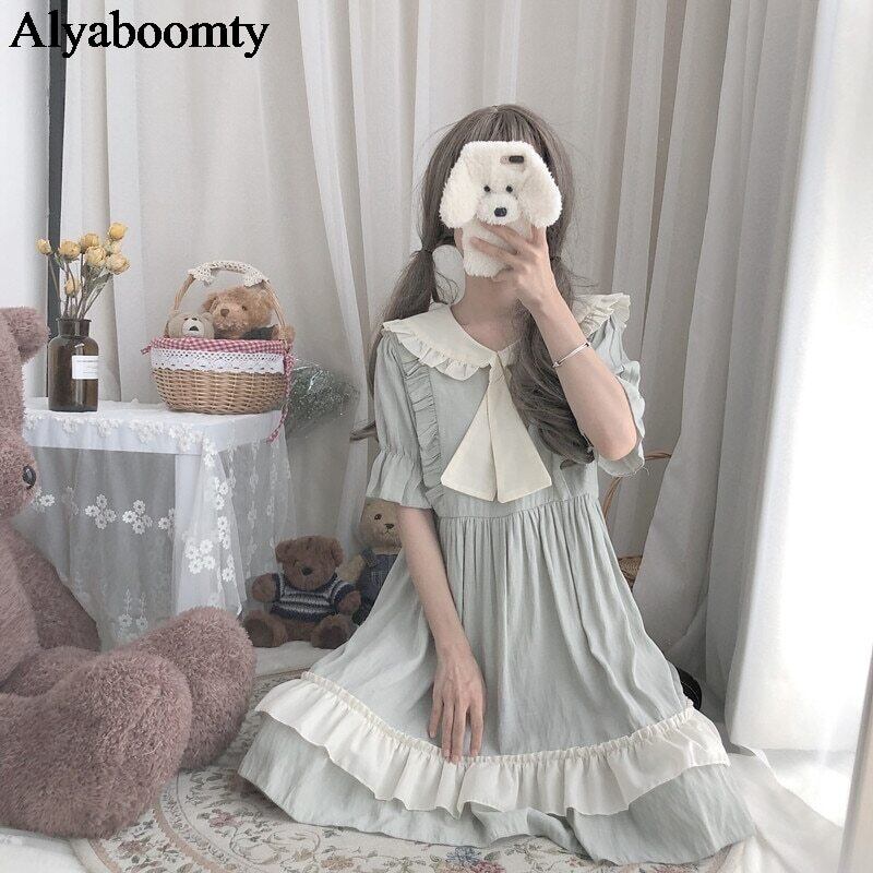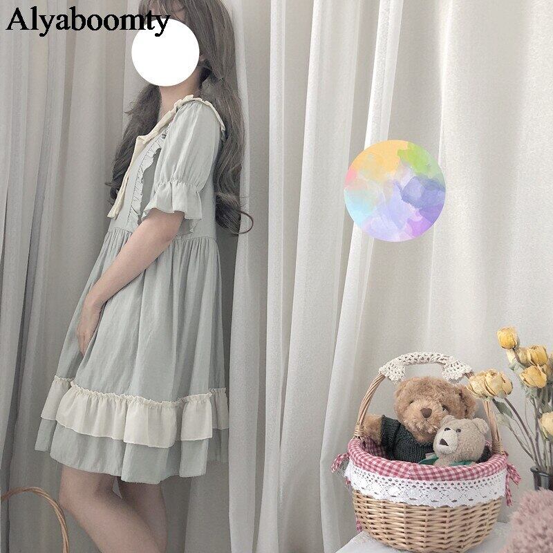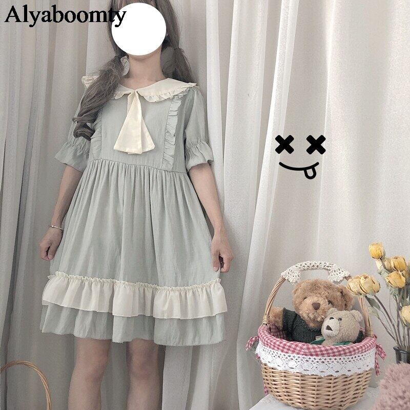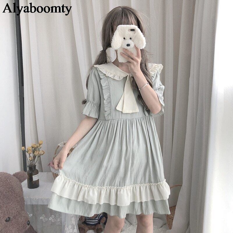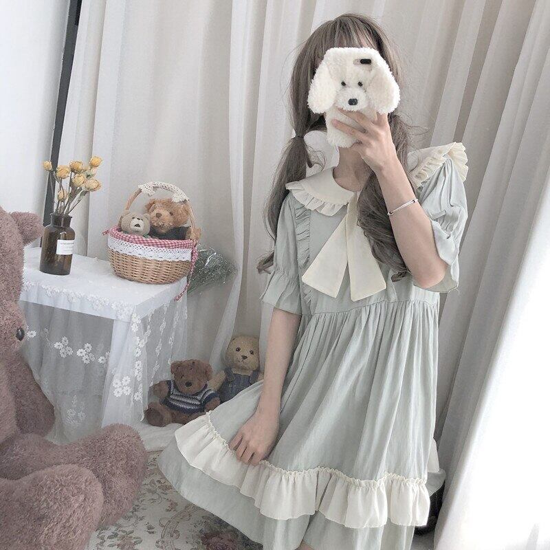 送料無料୨♥୧ eseロリータスタイルサマーレディース可愛いドレス ピーターパンカラーとリボン柔らかい姉妹半袖スリーブフリル AOS48389516555