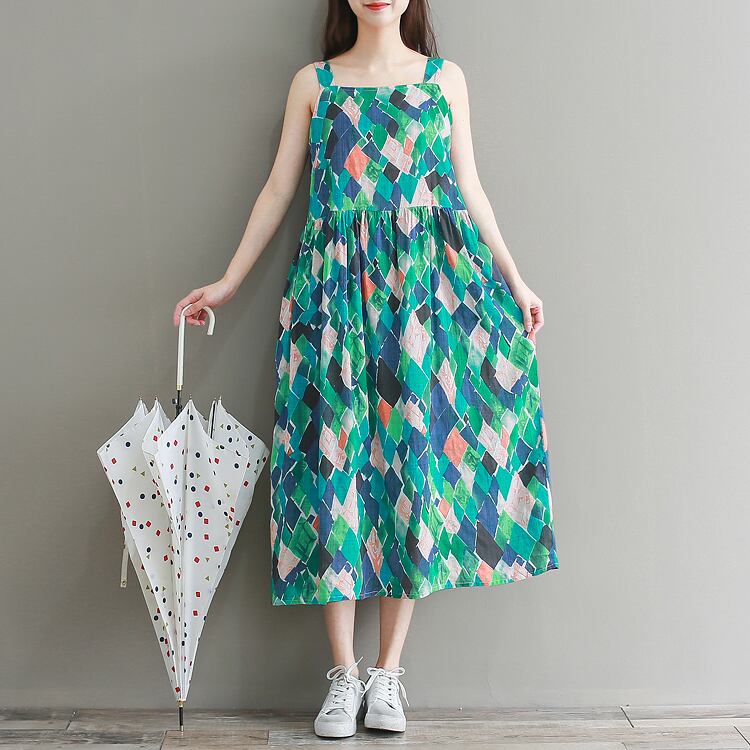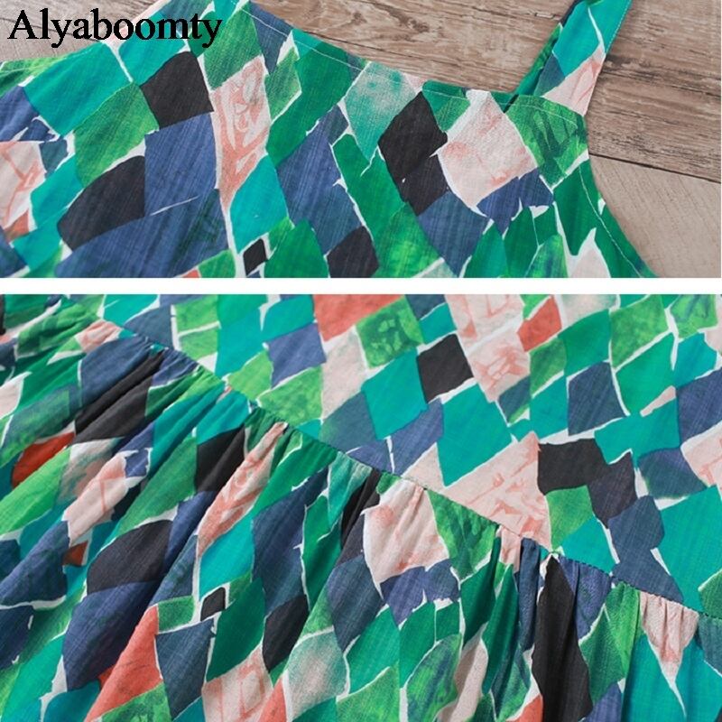 送料無料୨♥୧ 森サマーレディースミディビーチドレス グリーンプリントルーズ休日ヴィンテージコットンロングドレス ワンピース AOS7086758304