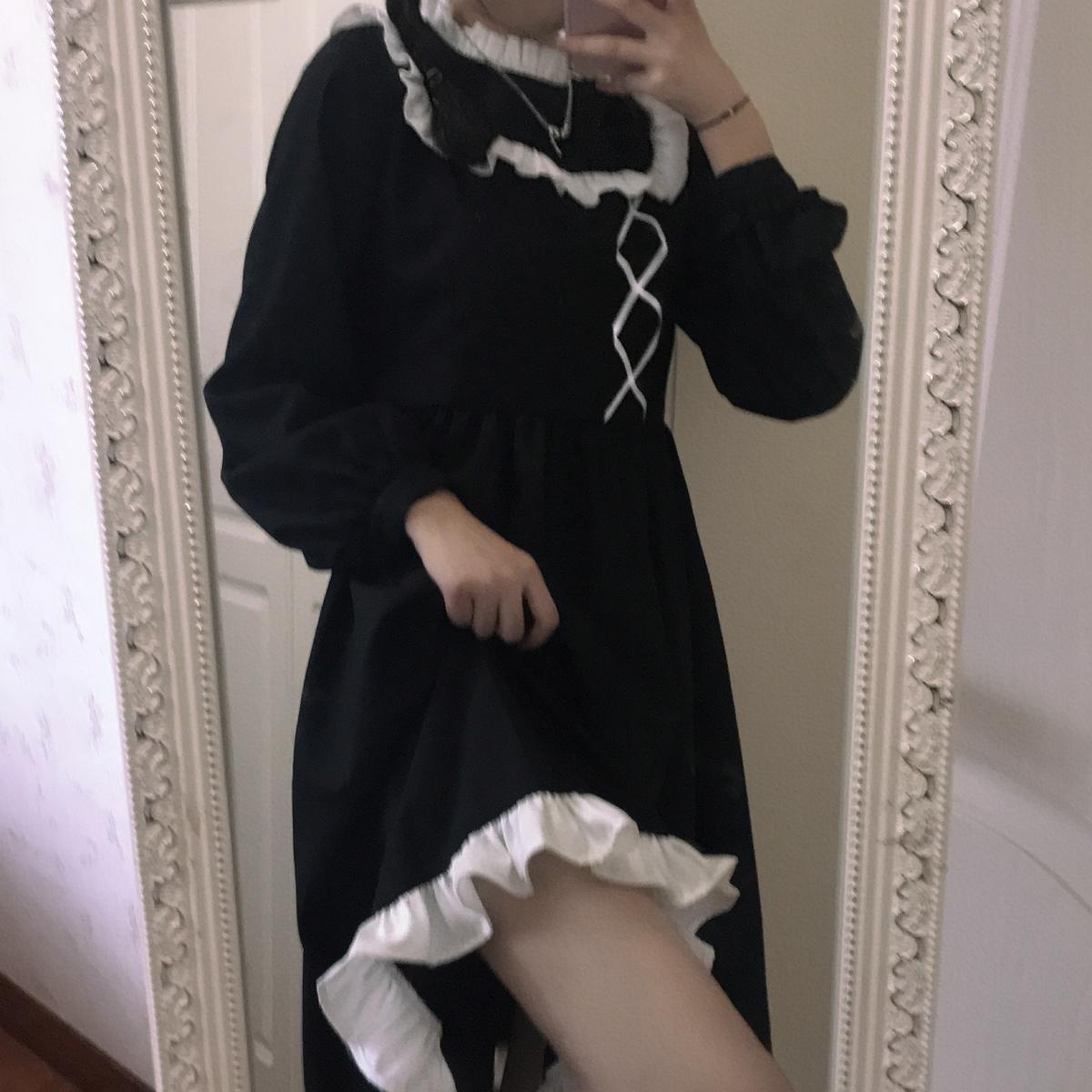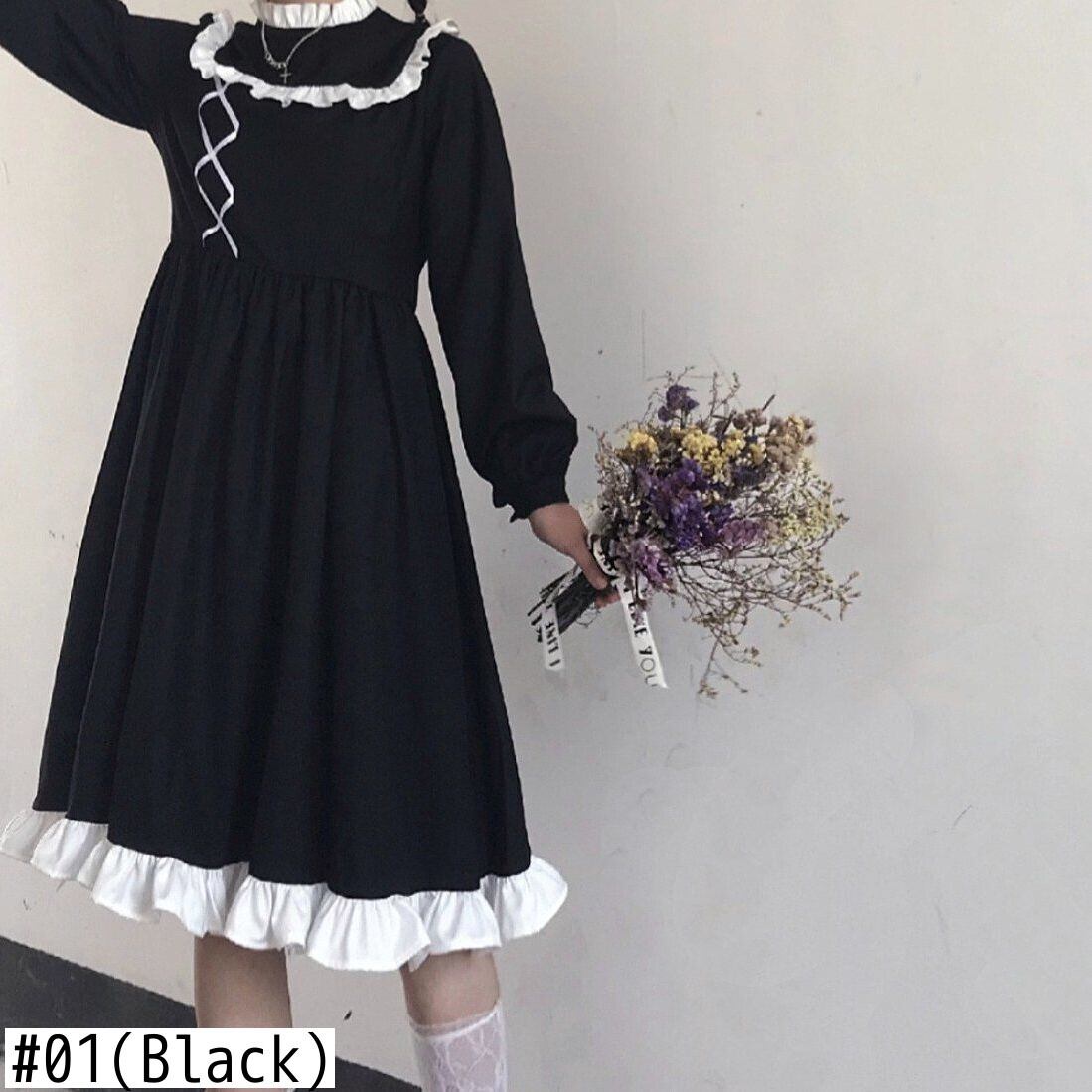送料無料୨♥୧ ese原宿スプリングオータムレディースブラックドレス カラーバンドゴシックコスプレ長袖スリーブスタンダードフリル AOS98041727951