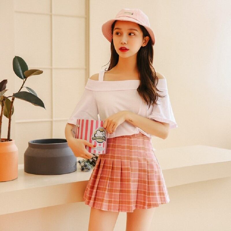 送料無料୨♥୧ eseプレッピースタイルサマーレディースミニスカート ウェストグレーピンク格子柄可愛いのコットンプリーツ AOS56327915441
