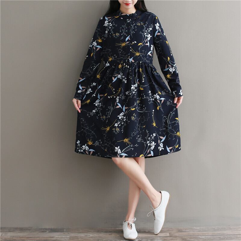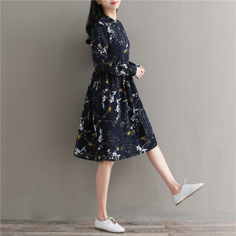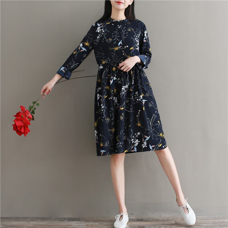 送料無料୨♥୧ 森スプリングオータムレディース可愛いドレス スタンドカラーカラーフローラルプリント柄シフォンベスティドス一杯スリーブネイビーブルーヴィンテージ AOS49651820819