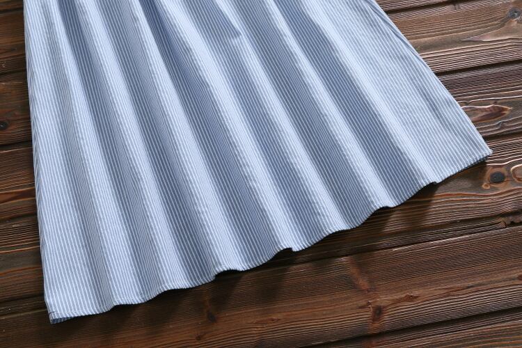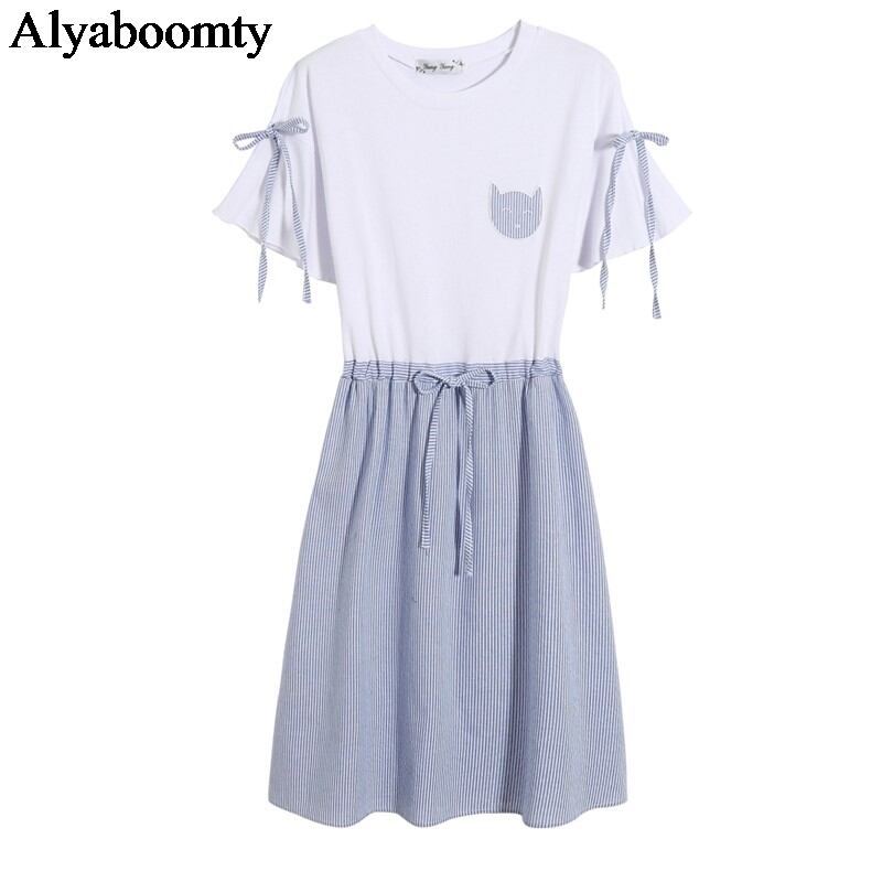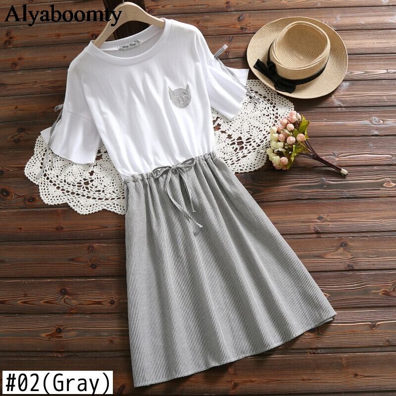 送料無料୨♥୧ プレッピースタイルサマーレディースoAラインコットンドレス 首ネコストライプレースアップ半袖スリーブブルーグレーの甘い AOS20463745751