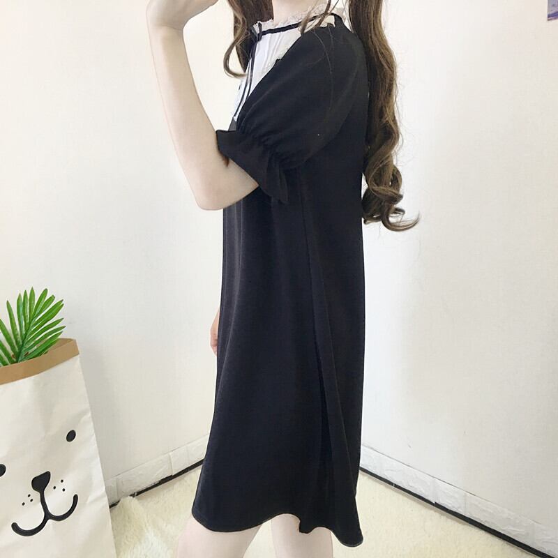 送料無料୨♥୧ ese原宿レディースブラックミニドレス ゴシックスタンドカラーカラーレースリボン尼僧半袖スリーブロリータのドレス ワンピース AOS24741506004