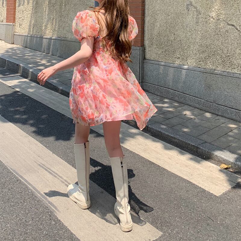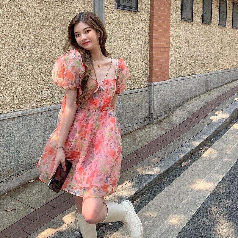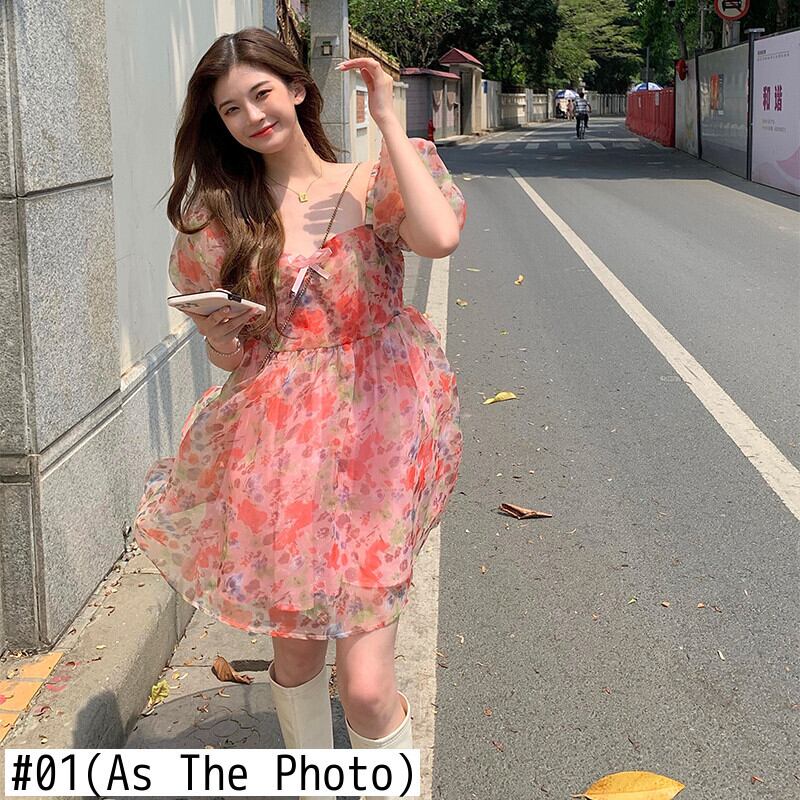 送料無料୨♥୧ 2021プラスサイズサマーレディースフローラルドレス 平方カラーリボン甘いメッシュパフスリーブオーガンザ AOS23906088634
