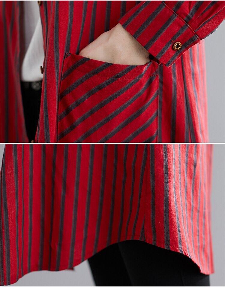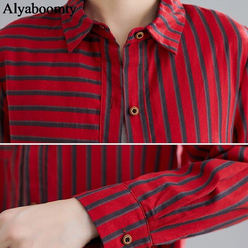 送料無料୨♥୧ 2020スプリングオータムレディースロングシャツ 断るカラーレッドイエローグリーンストライプカーディガンヴィンテージコットンブラウス AOS34473037501