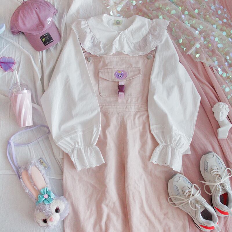 送料無料୨♥୧ eseロリータスタイルレディースホワイトシャツ ピーターパンカラーホローでるコットンブラウス 可愛いくま刺繍愛らしい AOS69627335160