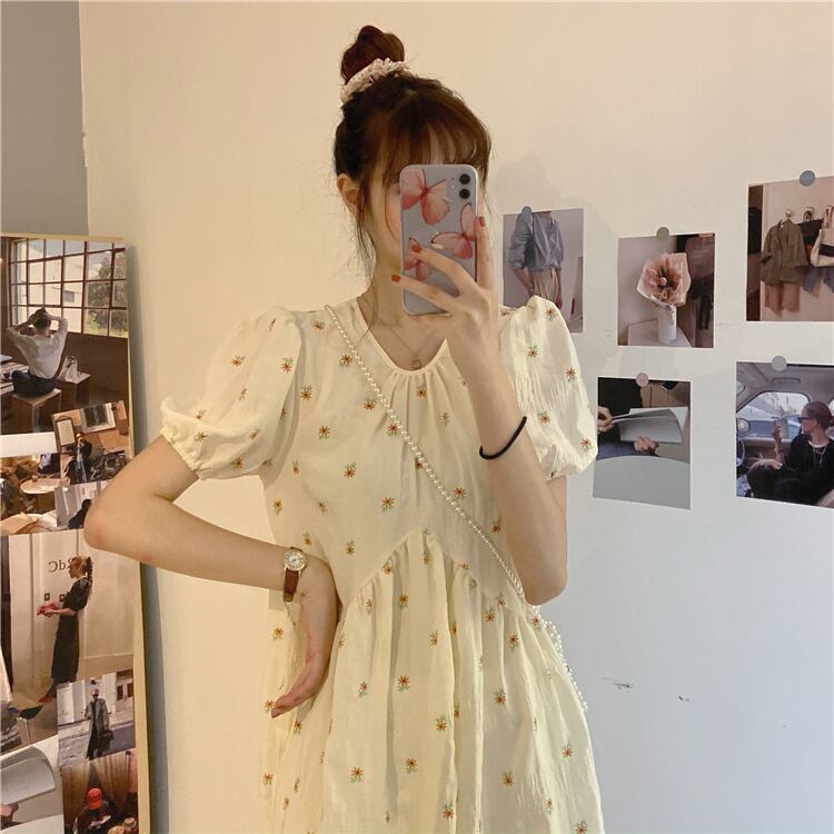送料無料୨♥୧ 2021森oサマーレディースミディシックドレス 首フローラルルーズアプリコットvestidoパフスリーブ刺繍甘い AOS10929141579