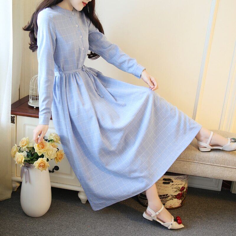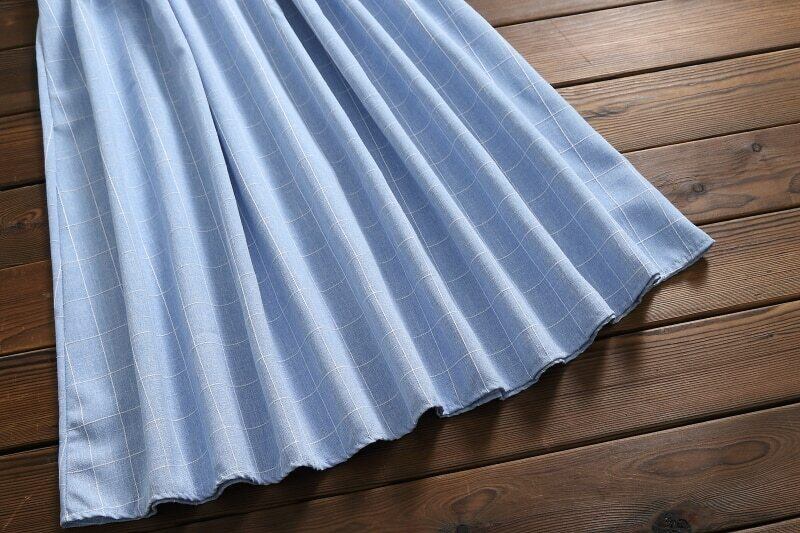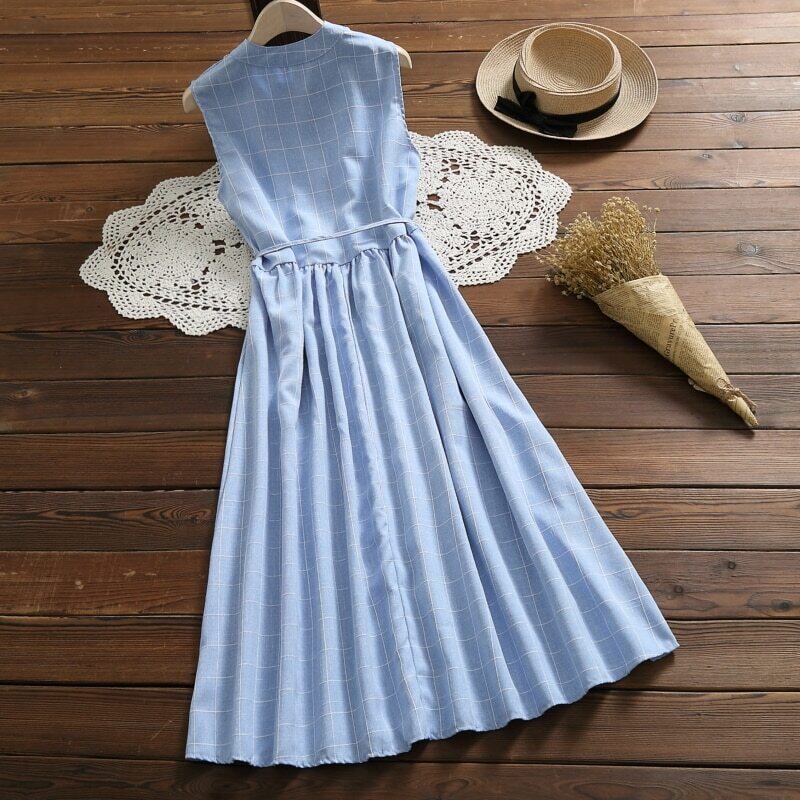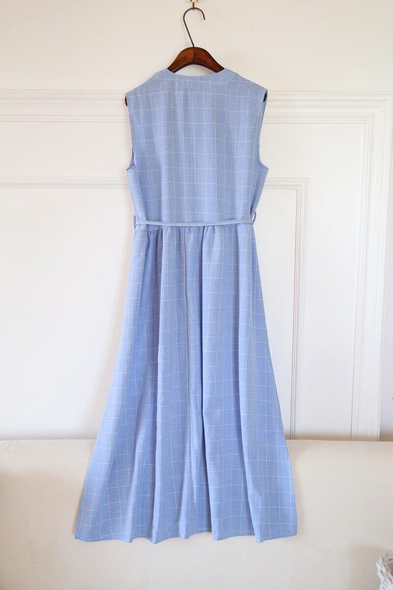 送料無料୨♥୧ 森サマーレディースノースリーブロングドレス スタンドカラーカラーコットンタンクブルーグレー格子柄s-xxl AOS10428696561