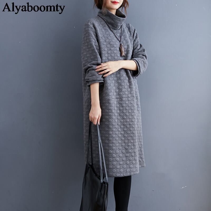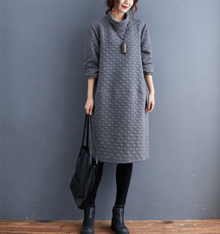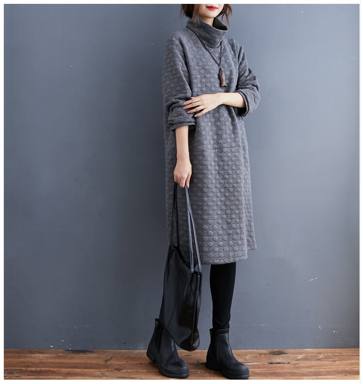 送料無料୨♥୧ スタイルプラスサイズオータムウィンターレディースドレス タートルネックグレー水玉特大厚いヴィンテージルーズチュニック AOS34817051761