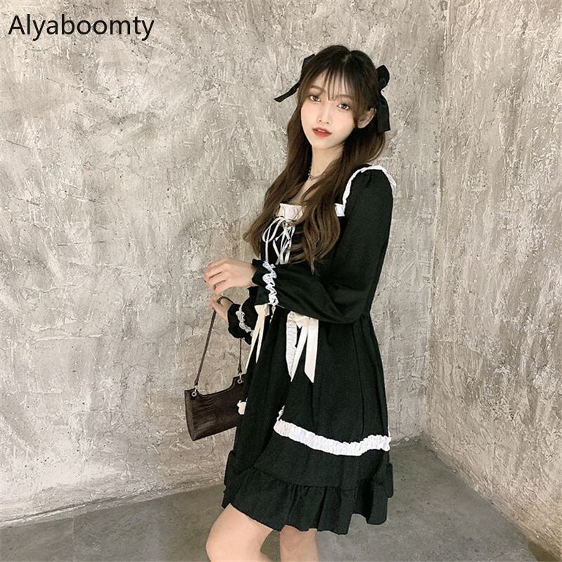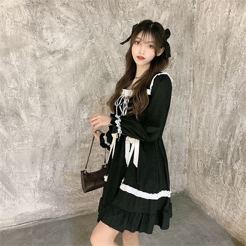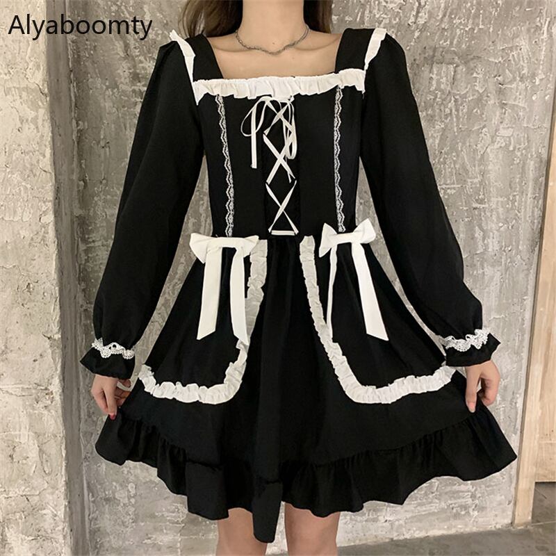 送料無料୨♥୧ ese原宿ストリートウェアレディースブラックミニドレス 平方カラーリボンバンドコスプレ可愛いゴシックパンクスタイル AOS77218314091