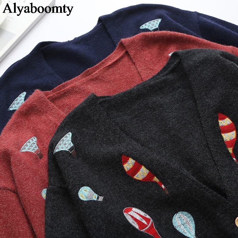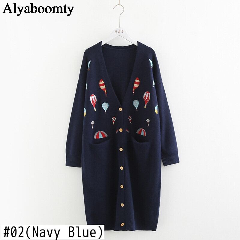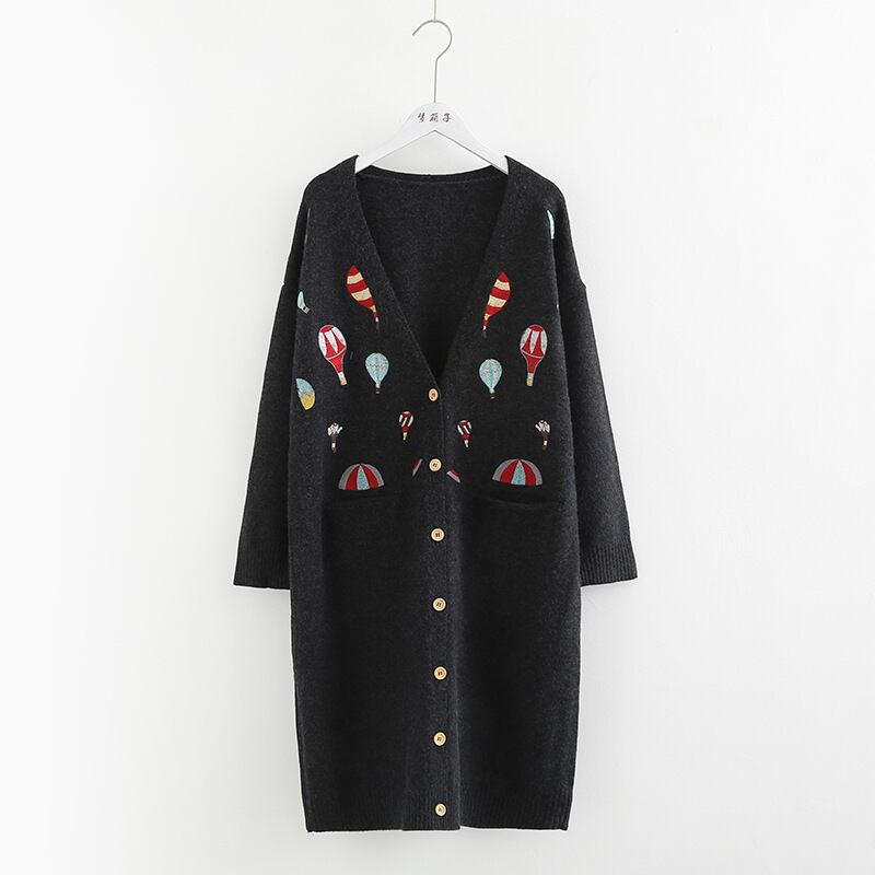 送料無料୨♥୧ ese森オータムウィンターレディースロングカーディガンVネックバルーン刺繍ルーズセーター 厚い AOS74084466705