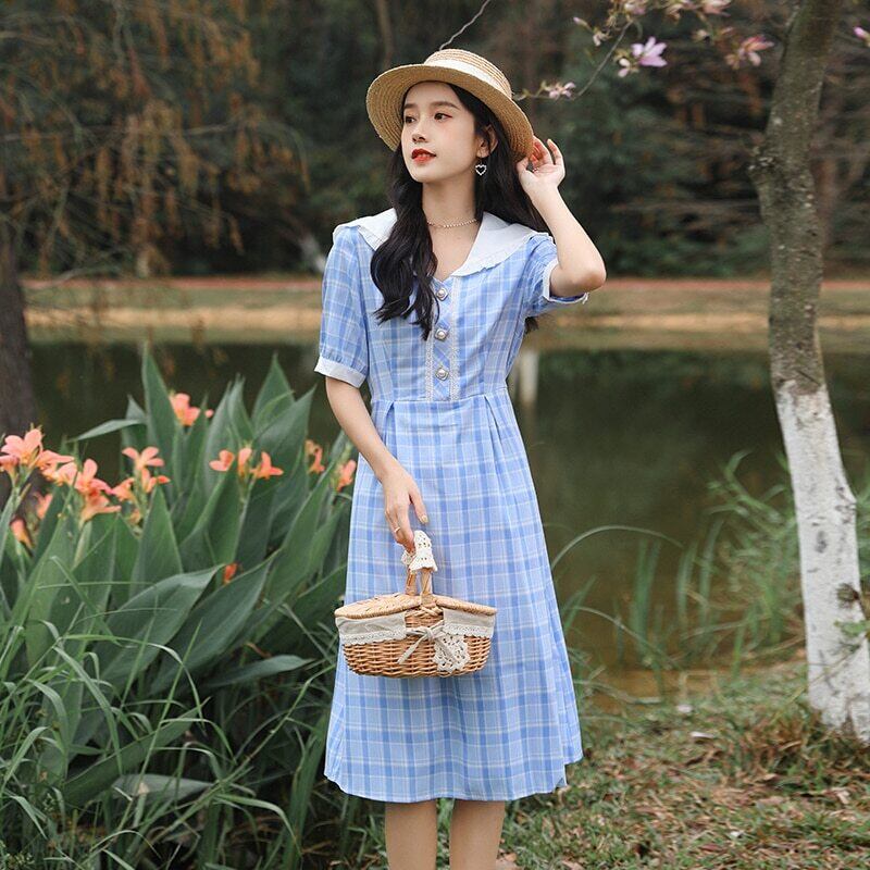 送料無料୨♥୧ 2021eseサマーレディースブルー格子柄ドレス 断るカラーボットンウェストベスティドス半袖スリーブ船乗り AOS29847684