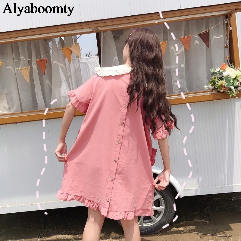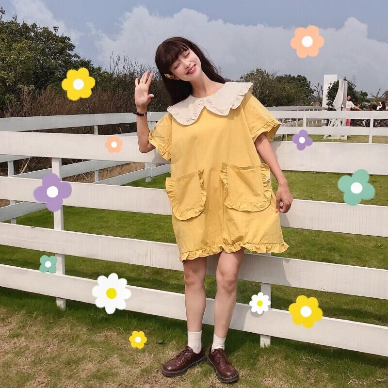 送料無料୨♥୧ eseプレッピースタイルサマーレディースミニドレス ピーターパンカラーイエローピンク特大可愛いフリル AOS66324237763