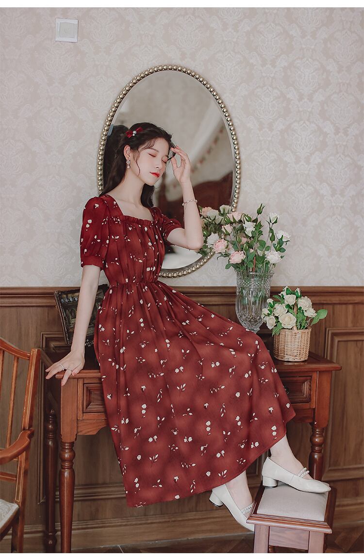 送料無料୨♥୧ サマーレディースフランス語Aラインミディドレス 平方カラーフローラルプリント半袖スリーブヴィンテージ甘いシック AOS3099178861
