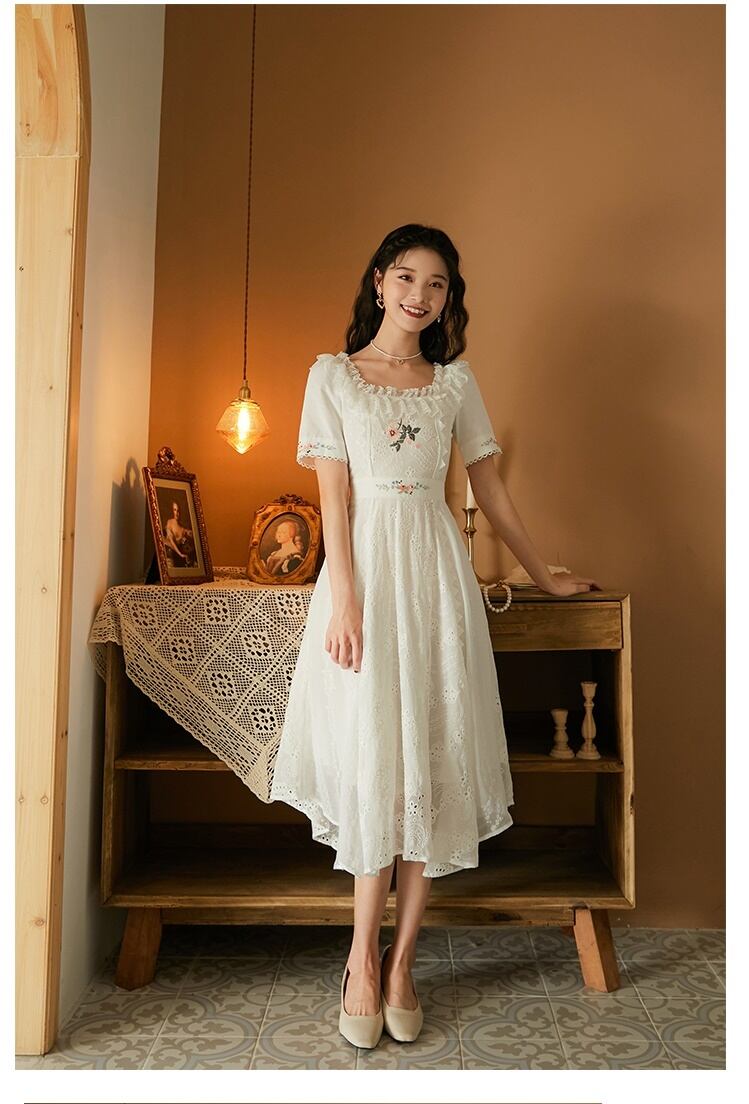 送料無料୨♥୧ 2021サマーレディースロマンチックホワイト妖精ロングドレス レースフリルホローでる繊細パーティーフローラル刺繍 AOS27049159083