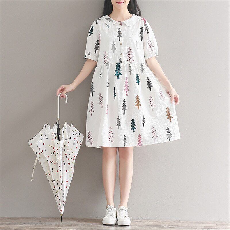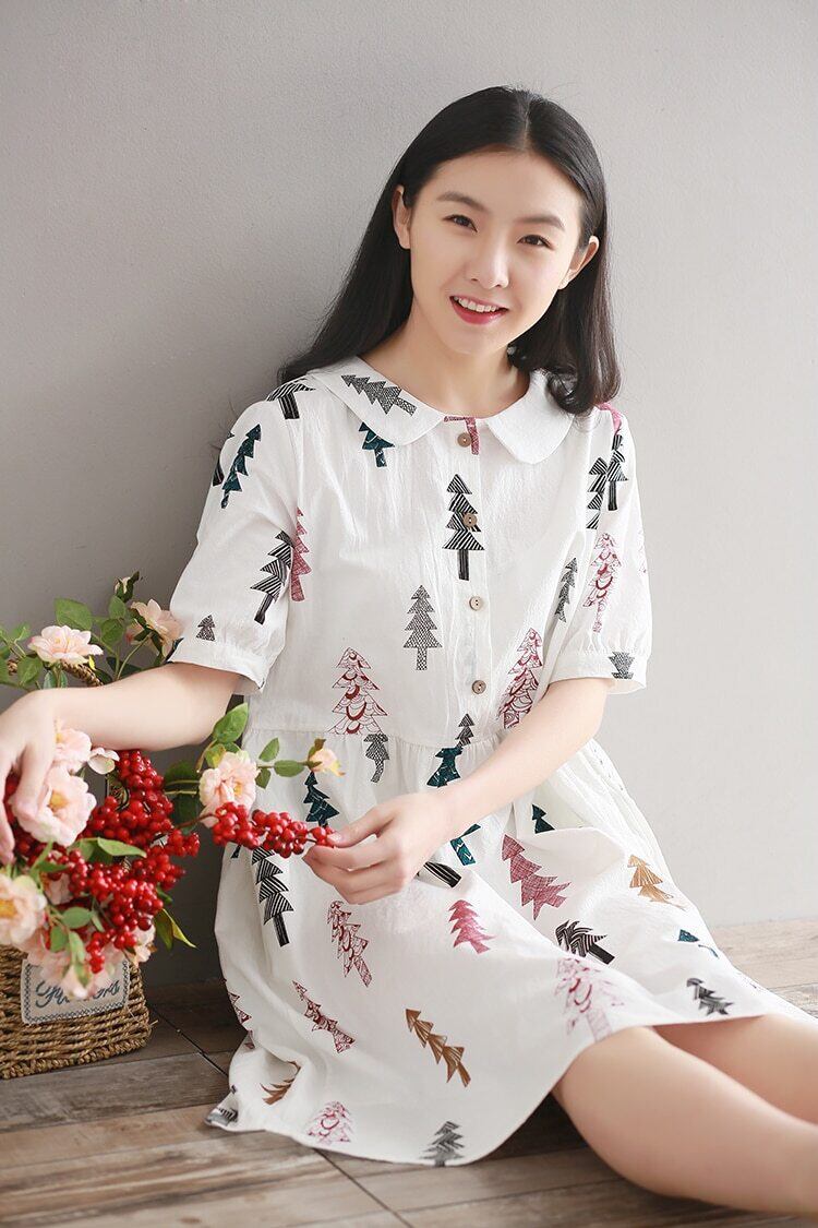 送料無料୨♥୧ 森サマーレディースコットンドレス ピーターパンカラー木パターンルーズ半袖スリーブ甘いプレッピー AOS72748829538