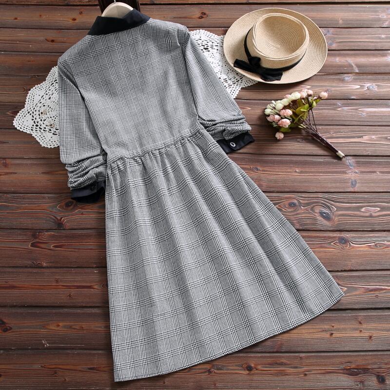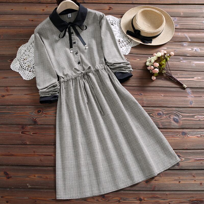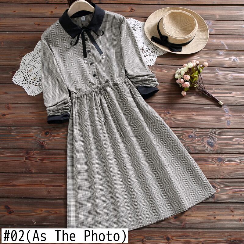 送料無料୨♥୧ 森オータムスプリングレディーススタンダードドレス 断るカラー格子柄レースアップベスティドス長袖スリーブリボンルーズドレス ワンピース AOS16049019941