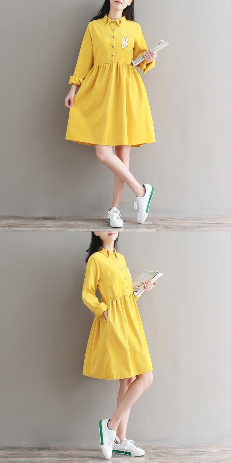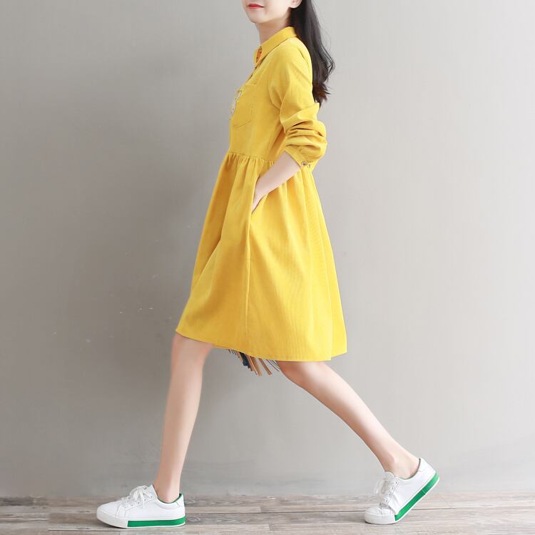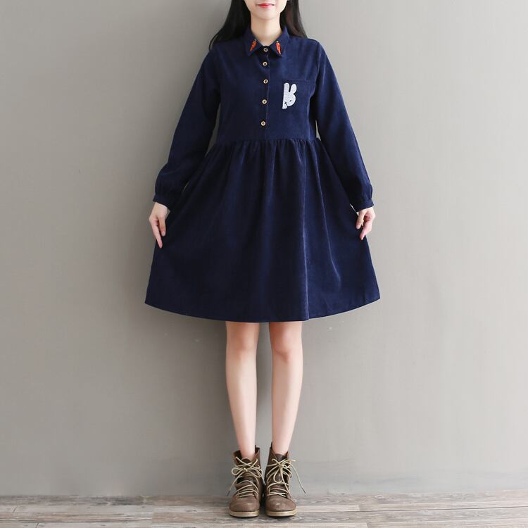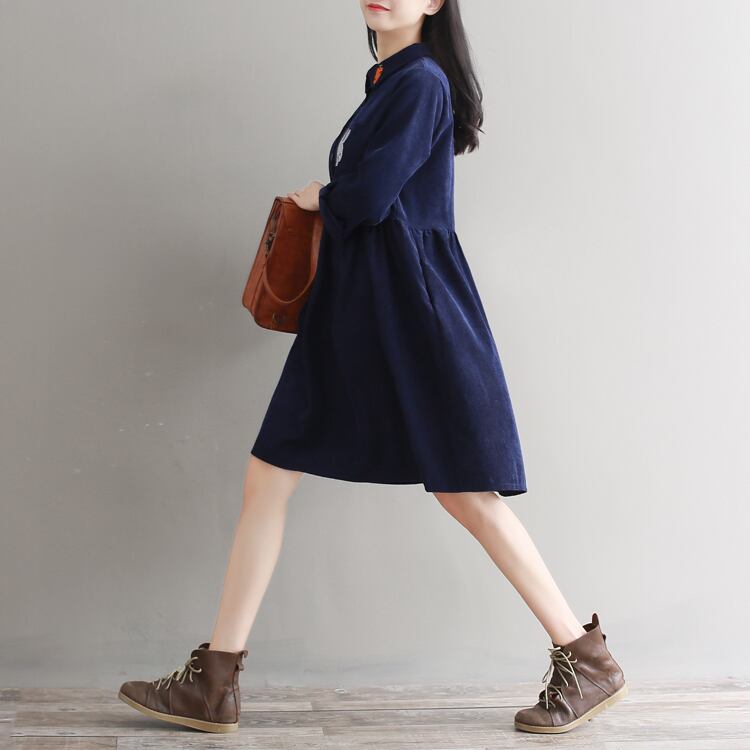 送料無料୨♥୧ オータムスプリング森レディースルーズ服イエローネイビーブルー刺繍ドレス 可愛いコーデュロイ AOS12195529874