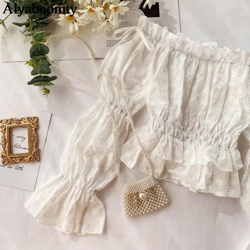 送料無料୨♥୧ シックサマーオータムレディース収穫トップス スラッシュ首バンドフローラル刺繍ブラウス フレアスリーブ甘い AOS60870705933