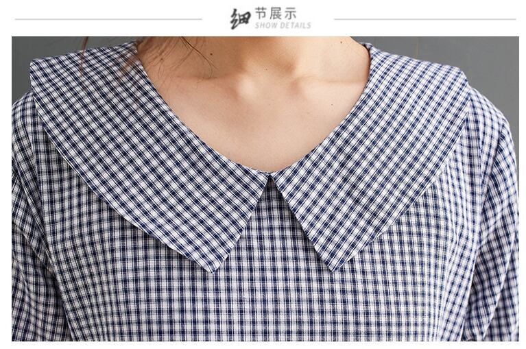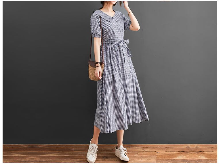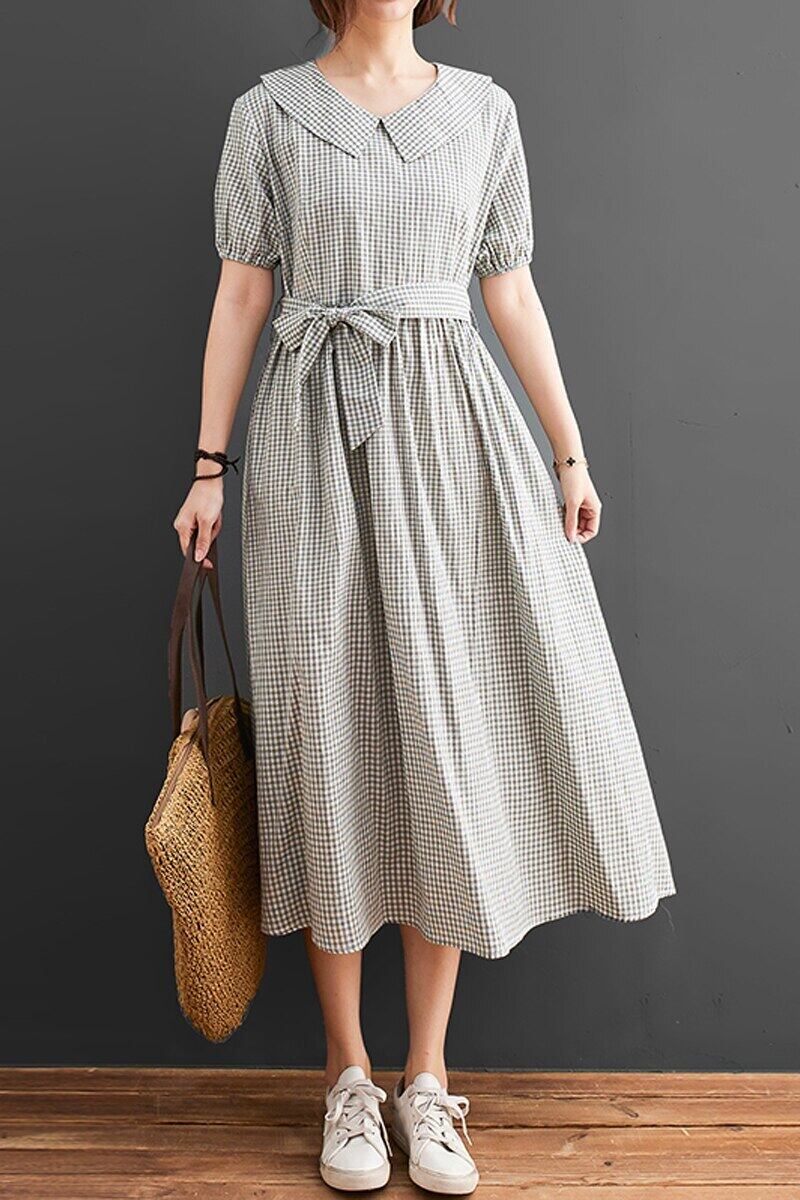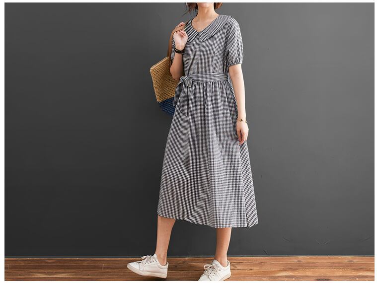 送料無料୨♥୧ 森サマーレディースロングドレス ピーターパンカラーピンクグリーンブルーオレンジブラック格子柄ヴィンテージコットンベルト 特大 AOS23222388065