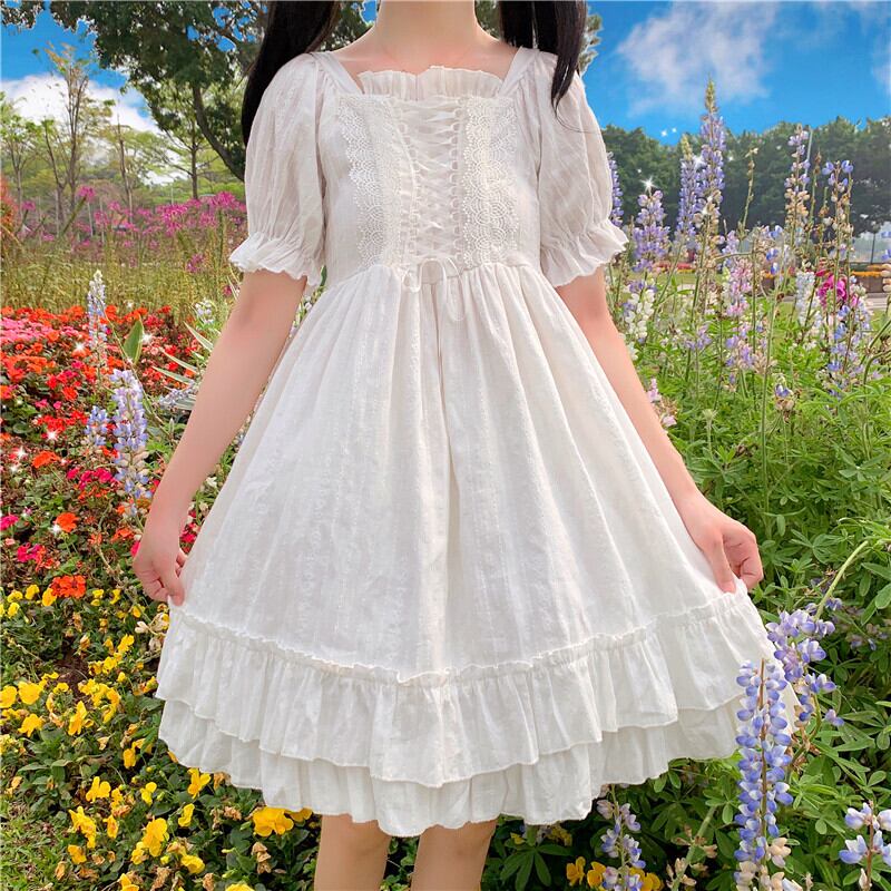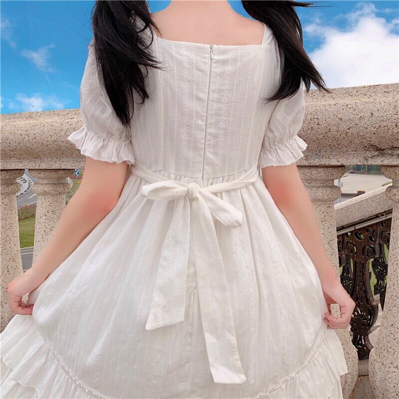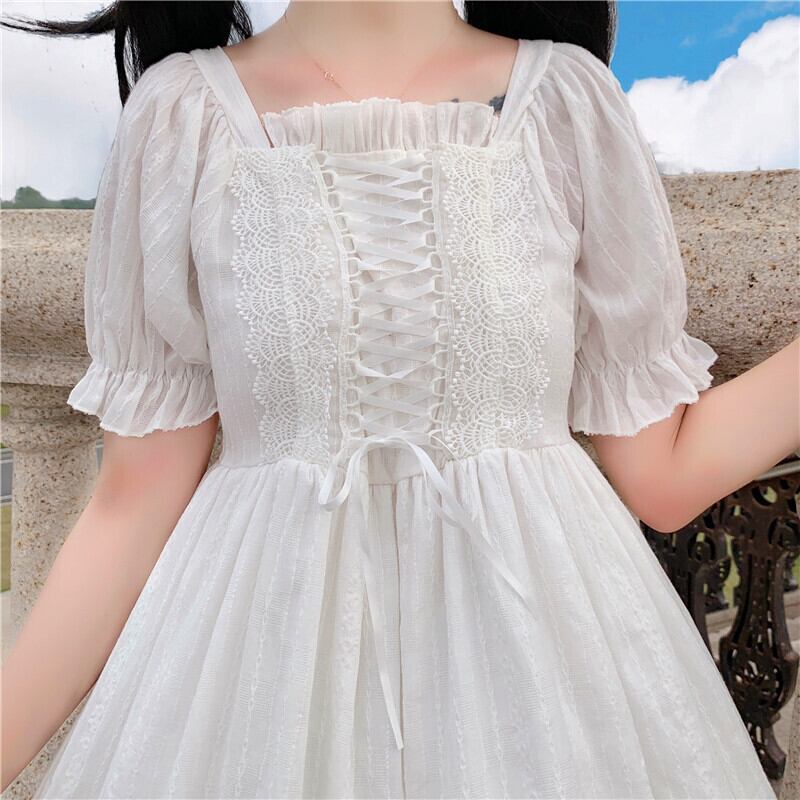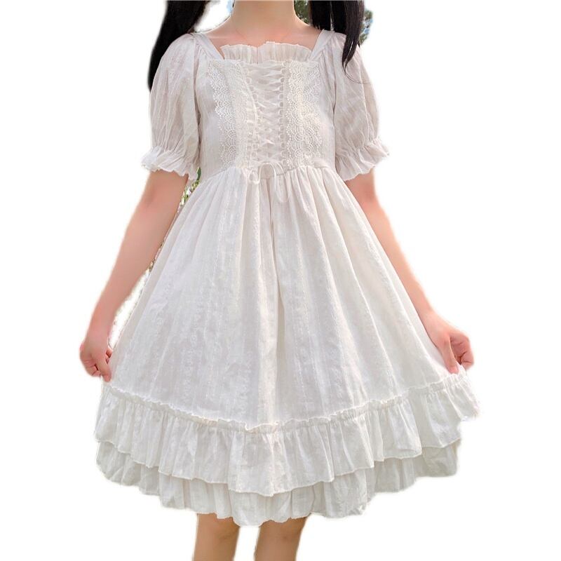 送料無料୨♥୧ 2021eseサマーレディースホワイトロリータドレス 平方カラーレースアップウェスト可愛いフリルパーティードレス ワンピース AOS28170617044