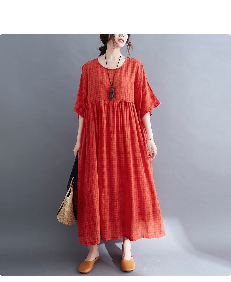 送料無料୨♥୧ 特大エスニック自由bo放に生きるレディースサマーマキシドレス ソリッド ルーズ余分な大休暇オレンジ格子柄Oネックスタンダードガウン AOS76772362445