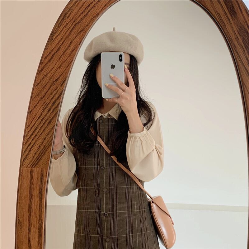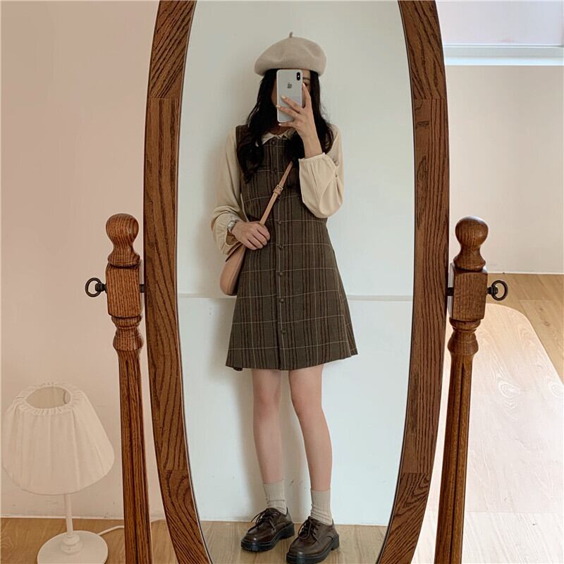 送料無料୨♥୧ 2021イングランドスタイルスプリングオータムレディースミニドレス 平方カラーブラウン格子柄ノースリーブ可愛いヴィンテージタンク AOS29379027323