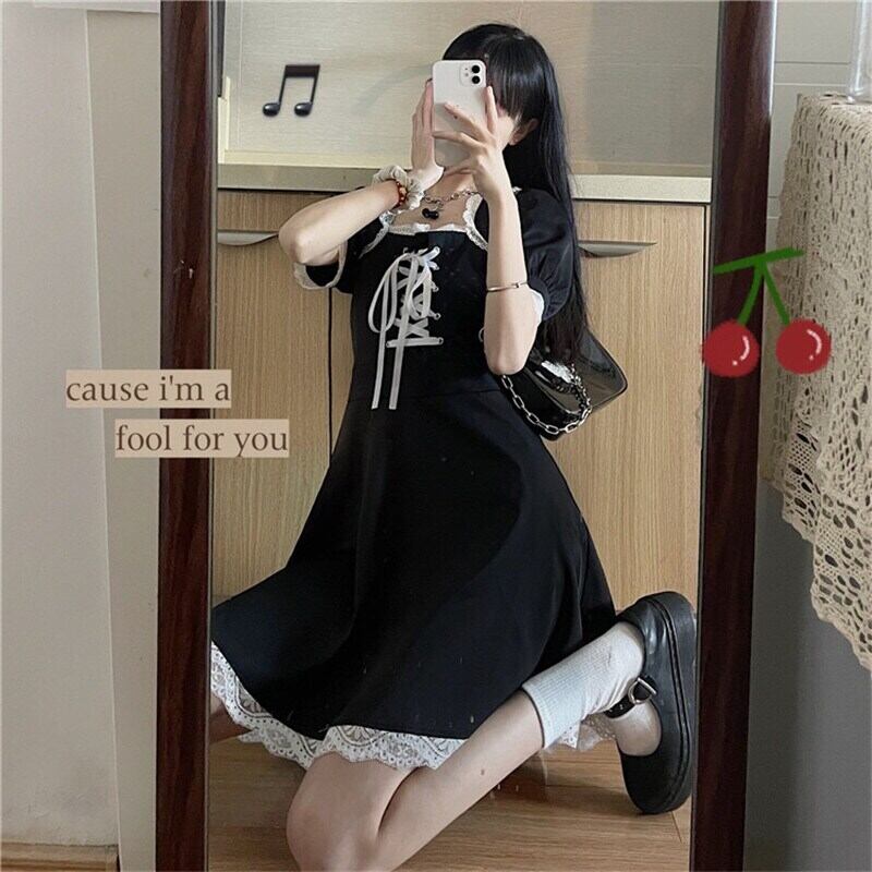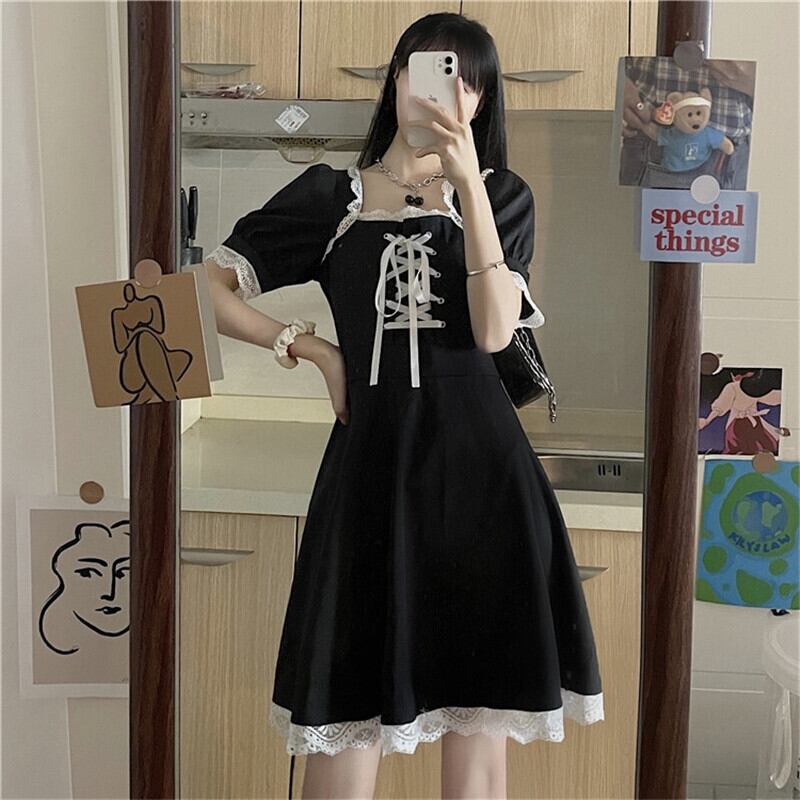 送料無料୨♥୧ 2021ese原宿サマーレディースブラックミニドレス 平方カラーレースバンドゴシックパンクスタイルストリートウェア可愛い AOS22191832753