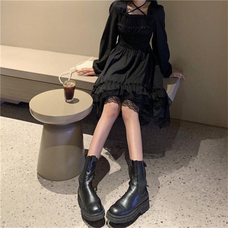 送料無料୨♥୧ ゴシックレディースブラック妖精パーティードレス クロス平方カラーロリータ不規則な可愛いレースフリルシック AOS72658066464