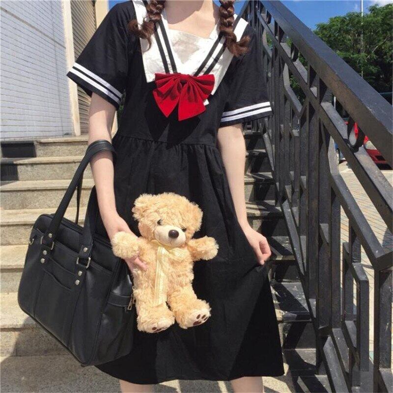 送料無料୨♥୧ eseプレッピースタイルサマーレディース可愛いドレス 船乗りカラーブラックルーズjk半袖スリーブコットンとリボン AOS97235558462